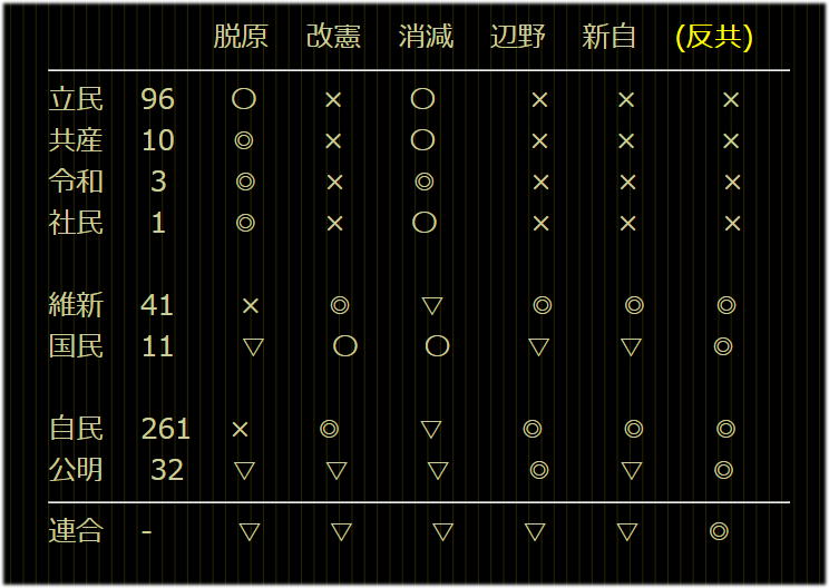 ![]() , 以下は総選挙に参加した主要政党の主要政策に対するスタンスです。連合は政党ではありませんが、参考のため入れました。また政策の最後にある反共は党に対する基本姿勢を示します。 、なお、スタンスは青山の評価なので、実際とは少し異なる可能性があります。 , こうしてみてくると、維新は自民とほぼ同じ、国民もそれに準ずる、さらに寄り合い所帯で反共の連合は、たとえばトヨタが今後連合を抜けだし、資本・経営母体と一体となり、より新自由主義を推し進めるとともに、輸出が多いことから消費増税に向う可能性があります。電力労連、電気労連はもともと原発再稼働、新増設に賛成のが立場です。 , このように今回の総選挙で連合票が国民だけでなく、維新に大きく流れたことが推定できます。 , 出典:青山貞一・池田こみち 2021-11-6 政党凡例1 立民:立憲民主党 共産:日本共産党 英和:れいわ新選組 社民:社会民主党 維新:日本維新の党 国民:国民民主党 自民:自由民主党 公明:公明党 連合:日本労働組合総連合会 党名右の数字は総選挙後の獲得議席 政策凡例2 脱原(脱原発) 改憲(健保改正) 消減(消費税減税) 辺野(辺野古基地建設中止) 新自(新自由主義経済) 反共(共産党へのスタンス) 判例3 ◎ 強く支持 〇 支持 ▽ 不明確 × 不支持 脱原 改憲 消減 辺野 新自 (反共) 立民 96 〇 × 〇 × × × 共産 10 ◎ × 〇 × × × 令和 3 ◎ × ◎ × × × 社民 1 ◎ × 〇 × × × 維新 41 × ◎ ▽ ◎ ◎ ◎ 国民 11 ▽ 〇 〇 ▽ ▽ ◎ 自民 261 × ◎ ▽ ◎ ◎ ◎ 公明 32 ▽ ▽ ▽ ◎ ▽ ◎ 連合 - ▽ ▽ ▽ ▽ ▽ ◎ 上記結果を見ると、国民の70%以上が脱原発を望むのに与党だけでなく、維新、国民、さらに連合が原発の再稼働や新増設を容認している実態は非常に違和感がある。また政策ではないが、選挙前から意図的にマスコミを利用しすすめられた反共産党の誹謗、プロパガンダは、与党だけでなく野党を含め全議席の74%が支持している。 これはまさに第二次世界大戦直後の米国におけるマッカーシズムではないか? 現在は、英、仏、独、西、葡、NZなど西側主要国を含め107ヵ国が社会主義労働者インターに参加している。メディアが与党の先棒を担いだり一体となって現在の日本のおとなしい「共産党」を誹謗中傷するのは言語道断の戦前回帰である! さらに本来労働者の味方であるはずの「連合」が反共の急先鋒となっている現実には驚嘆するほかはない。 もとよりトヨタなど日本の経団連傘下の大企業や傘下以外の多くの企業は、安い賃金の労働を求め、こぞって中国に進出している。一節には1万4千社以上と言われている。日本の共産党嫌いのトヨタ労組や連合は、この現実をどう説明するのか? ◆総選挙2021 見えてきた課題 WeN20211106 デモクラシータイムズ その後の情報です。 ![]() 上記については、チャンネル桜の最新号で、前自民党議員の安藤裕氏が明言している。 |