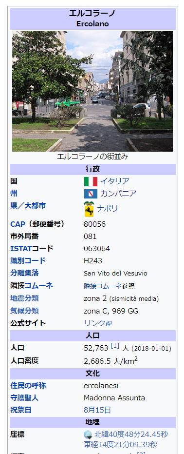 | <ヴェスヴィオ総合メニュー> エルコラーノ(コムーネ) ヘルクラネウム遺跡1 ヘルクラネウム遺跡2 本稿の解説文は、現地調査に基づく開設に加え、Wikipediaイタリア語版を中心に英語版からの翻訳及び日本語版を使用しています。また写真は現地撮影分以外にWikimedlia Commons、さらに地図はグーグルマップ、グーグルストリートビューを使用しています。その他の引用に際しては、その都度引用名をつけています。 ◆エルコラーノ(Ercolano、コムーネ) ![]() Source:Wikipedia 概要 エルコラーノ(イタリア語: Ercolano)は、イタリア共和国カンパニア州ナポリ県にある、人口約5万3000人の基礎自治体(コムーネ)です。 ヘルクラネウムの遺跡は、西暦79年のヴェスヴィオ火山の噴火により廃墟となったもので、近隣のポンペイやオプロンティス、トッレ・アンヌンツィアータとともに世界遺産「ポンペイ、ヘルクラネウム及びトッレ・アンヌンツィアータの遺跡地域」に登録されています。 ヴェスヴィオ登山の出発点として、ナポリから鉄道で来た観光客がバスあるいはタクシーで登山口まで向かいます。 地理 標高 44(0 - 1275)[2] m 面積 19.64 [3] km2 エルコラーノの位置(イタリア内)エルコラーノ ![]() ナポリ・ヴェスヴィオ・ロードマップ Source:Wikimedia Commons CC 表示-継承 3.0, リンク 地理 位置・広がり ヴェスヴィオ火山の西麓に位置するコムーネ。ナポリ中心部から南東へ8kmの距離にあります。以下のグーグルマップを参照のこと。 ![]() 出典:グーグルマップ 隣接コムーネ 隣接するコムーネは以下の通りです。 ・ボスコトレカーゼ ・マッサ・ディ・ソンマ ・オッタヴィアーノ ・ポッレナ・トロッキア ・ポルティチ ・サン・ジョルジョ・ア・クレマーノ ・サン・セバスティアーノ・アル・ヴェズーヴィオ ・サンタナスタジーア ・ソンマ・ヴェズヴィアーナ ・トッレ・デル・グレーコ ・トレカーゼ 地勢 ヴェスヴィオ山の最高地点 (1281m) は、エルコラーノとオッタヴィアーノの境界にあるとされる[2]。 歴史 古代ローマ時代の79年、ポンペイと共にヴェズーヴィオ山の噴火により埋没した町、ヘルクラネウムの遺跡があることで有名。ポンペイとは異なり、エルコラーノは火山泥流に襲われた。当時の木製の階段や縄などが炭化した状態で保存されています。 ヘルクラネウム遺跡1へつづく |