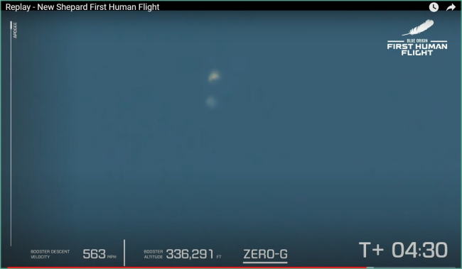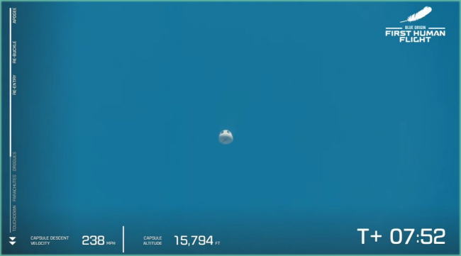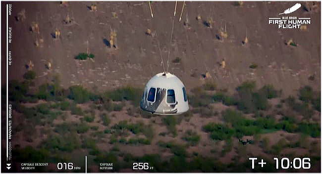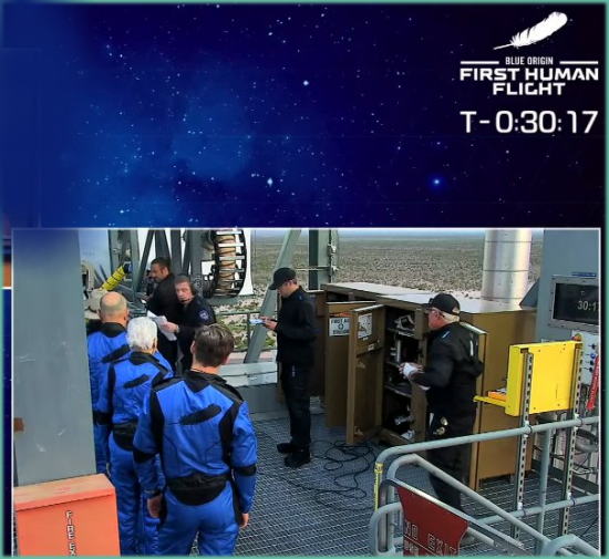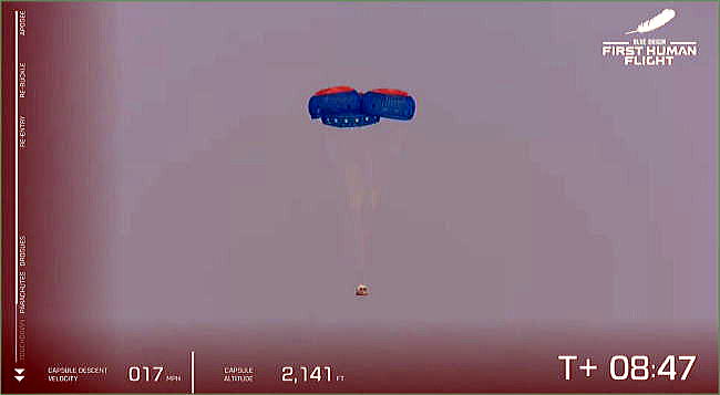 米国のアマゾン・ドット・コム創業者ジェフ・ベゾス氏(57)が率いる宇宙開発ベンチャーのブルーオリジン(Blue Origin)は2021年7月20日、テキサス州にて自社開発したロケット「ニューシェパード」を打ち上げ、初の有人飛行に成功した。 4仁を乗せた宇宙船カプセルは発射から3分過ぎにロケットから切り離された。高度は約107キロ、数分間の無重量状態を体験した後、パラシュートで無事地表に軟着陸した。飛行時間は約10分10秒。 以下はブルー・オリジン社による実時間動画配信により発射前解説、発射、ロケットから宇宙船の切り離し、パラシュートに夜軟着陸、地上での家族、報道陣等への再開の一部始終の静止画切り出しである。 ![]() 動画はこちら 有人飛行に参加した4人。ジェフ・ベゾス氏(57歳)、入札で30億円払ったオランダ人の息子、元女性飛行士(82歳)。 ![]() ![]() パブリックビューで一部始終を見る市民 ![]() 事前に1時間以上の解説を行ったブルー・オリジンのスタッフ。 ![]() 米国西テキサスにある発射台 ![]() 発射台に向かう4仁 ![]() 発射台を登る4人 ![]() 発射台の途中の4人 ![]() 発射台に取り付けられたロケットと宇宙船カプセル ![]() 担当者(右)から最終打ち合わせを受ける4人(左側) ![]() 発射ちょっくぜんのカプセル ![]() カプセルに乗り込む4人 ![]() 15分前 ![]() 発射 離陸 切り離し 地上軟着陸の図解。ロケットは再利用のため回収される。 ![]() 以下は打ち上げ前のロケット先端部分と宇宙船(カプセル)。カプセルに4人が乗り込んだ後のテイクオフの約1分45秒前の写真である。 発射 1分45秒前 ![]() 発射 ![]() 以下は宇宙ロケット+宇宙船が発射約1分後、地表から約9kmに達した際の映像(切り出し写真)。 以下に27,652ftとあるが、これは約9kmを意味する。 ![]() 発射後約3分後、高度は約30km ![]() 以下は宇宙ロケット+宇宙船が地表約100kmに到達した際の映像(切り出し写真)。 以下に302,226ftとあるが、これは約100kmを意味する。 好天なのでビデオカメラのズームで、しっかりととらえらている。 ![]() 発射後約4分30秒後、高度は約110km ![]() 以下は打ち上げ後、7分52秒後、切り離されたカプセル、切り離したロケット共に指定された場所に帰還している。ただし、カプセル内の写真、映像は今のところ一切なく、宇宙遊泳の写真、映像は今のところなし。 ![]() 発射7分38秒後、打ち上げに使われたロケットは西テキサスの別基地に軟着陸。次回にも使用される。 ![]() 以下は打ち上げ後、8分47秒後、カプセル部分をパラシュートを使い軟着陸する前の映像(切り出し写真)。 ![]() 以下は打ち上げ後、丁度10分後で地球に帰還した時の映像(切り出し写真)。 ![]() ![]() 以下は地表へ帰還した宇宙船。すでに着陸地点にマスコミが来ている。 ![]() ![]() |