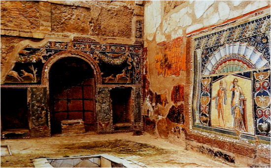 ![]() 写真右奥は池田こみち 撮影:青山貞一 Nikon Coolpix S8 2016年2月 現地ブロック案内 ヴェスヴィオ総合メニュー 用語集 本稿の解説文は、現地調査に基づく解説、写真撮影に加え、Wikipediaのイタリア語版を中心に英語版からの翻訳及び日本語版を使用しています。また写真は現地撮影分以外にWikimedlia Commons、さらに地図はグーグルマップ、グーグルストリートビューを使用しています。その他の引用に際しては、その都度引用名をつけています。 ブロック V サムナイトの家1 サムナイトの家2 美しい中庭の家1 美しい中庭の家2 コリント式アトリウムの家1 コリント式アトリウムの家2 二百年祭の家1 二百年祭の家2 炭化した家具の家1 炭化した家具の家2 ネプチュ-ンモザイクの家1 ネプチュ-ンモザイクの家2 大きな門の家1 大きな門の家2 木の神棚の家 ◆ネプチューン・モザイクの家 (Ins V, 6-7) ( Casa di Casa di Nettuno e Amfitrite(伊)、House of the Neputune(英)) ネプチューン・モザイクの家家は、ファウチ、アトリウム、タブリナム、庭の標準的な間取り(レイアウト)を持っています。ファウチ(a)はカルドIVの東側から開きます。その北側には小さなサービスルームがあります。 ファウチは、その中心に大理石の裏地インブリウムを持つ大きなアトリウム(b)に直接つながっています。 ![]() ネプチューン・モザイクの家の平面(間取り) 参照:AD79eruption - Google Sites .. ![]() 撮影:青山貞一 Nikon Coolpix S8 2016年2月 ![]() 撮影:池田こみち Nikon Coolpix S6400 2016年2月 ![]() 撮影:池田こみち Nikon Coolpix S6400 2016年2月 プチューンとアムピトリーテーの解説 正式にはネプチューンとアムピトリーテーのモザイクの家(Neputune and Amphitrite Mosaic House)と言い、(インスラ(ブロック)Ⅴ、カルドⅣ、No.7)にあります。 そのエレガントな二階建ての家には素敵な夏用のダイニングルーム(トリクリニウム)があります。その食堂は色彩の美しいモザイクにより泉の女神(ニンファエウム nymphaeum)を描いた装飾が施されていて、他にもネプチューンとアムピトリーテー(ポセイドン)の絵や狩猟の様子を描いた絵が飾られています。 注)ニンファエウム(ラテン語: nymphaeum) 古代ローマや古代ギリシアで泉の神ニンフ(ニュンペー)を祀る 場所または神殿のこと。古くは自然の洞穴などをニンフ信仰に 結びつけていたが、後に瀟洒な装飾を施した建物などが建てら れるようになった。 注)ネプチューン ネプチューン(Neptune、ネプトゥーン、あるいは、ネプテューヌ、 ネプテューンとも)はローマ神話の神・ネプトゥーヌスの英語読み。 ギリシア神話のポセイドンに相当する。 注)アムピトリーテー(Amphitrītē) ギリシア神話の海神ポセイドーンの妃で海の女王である。アンフィ トリーテー、長母音を省略してアムピトリテ、アンピトリテ、アンフィト リテとも表記される。名前の意味は「大地を取り巻く第三のもの」、 即ち海をあらわす。聖獣はイルカで、象徴は冠、ヴェール、王笏。 ローマ神話の海水の女神サラーキアと同一視される。 <参考>アムピトリーテーとポセイドーンとの結婚 後世の神話ではアムピトリーテーとポセイドーンの結婚の物語が語ら れている。それによればアムピトリーテーは姉妹たちとともにナクソス 島で踊っているときにポセイドーンによってさらわれた。あるいはポセ イドーンの求婚に最初は抵抗したが、ポセイドーンからイルカをプレゼ ントされ、婚姻を承諾した。 以下は、ネプチューンとアムピトリーテーのモザイクを撮影する青山貞一です。モザイク画だけを見ると分かりませんが、モザイク画がある場所は、以下のようななかば廃墟化した建築物ののそれぞれ壁にあります。 ![]() ネプチューンとアムピトリーテーのモザイクの家(Neputune and Amphitrite Mosaic House) 撮影:池田こみち Nikon Coolpix S6400 2016年2月 タブリナムからは、壁にネプチューン・モザイクの装飾が施された後方に美しく装飾されたコートを見渡せます。 その中に赤い線で描かれた2つの大理石のスラブが見つかりました, そのうちの1つは、アーティストの署名、アテネのアレクサンダーがありました。 以下は、ネプチューンとアムピトリーテーのモザイクがある壁のほぼ全景です。通常、観光ガイドではモザイク画だけがクローズアップされていますが、実物は以下のように大きな壁の一角にあります。 ![]() ネプチューンとアムピトリーテーのモザイクの家(Neputune and Amphitrite Mosaic House) 撮影:青山貞一 Nikon Coolpix S8 2016年2月 下の写真は上の写真の右側部分を撮影したものです。 ![]() ネプチューンとアムピトリーテーのモザイクの家(Neputune and Amphitrite Mosaic House) 撮影:池田こみち Nikon Coolpix S6400 2016年2月 以下がトリミングしたネプチューンとアムピトリーテーのモザイク画(Neputune and Amphitrite Mosaic )です。この写真のネプチューンとアムピトリーテーのモザイク画が観光案内にある写真に類するものですが、以下は実際に撮影した写真です。 ![]() ネプチューンとアムピトリーテーのモザイクの家(Neputune and Amphitrite Mosaic House) 