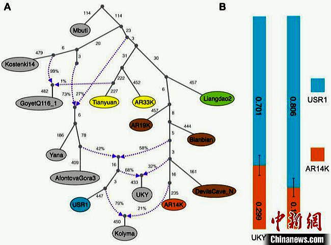 ![]() 2021年5月27日 23:16 ソース:中国新闻网参与互动参与互动 論文の筆頭著者である中国科学院古生物学研究所准研究員のマオ・シャオウェイ氏が研究成果を発表した。 中国通信社 孫子発 北京 5月27日 【新華社】 数万年前の氷河期というと、アニメ映画『アイス・エイジ』シリーズに登場する古代人のイメージや、マンモスやサーベルタイガーなど、今は絶滅したアニメ動物の共存を連想する人もいるだろう。 氷河期」の東アジアの人々の実生活はどうだったのか? 最後の極寒期(最終氷期、約26,500~19,000年前)の気候にどのように適応したのか。 このような疑問は、長い間、学界の関心事であった。 最終氷期の前後における東アジア北部の人口動態。 写真提供:研究チーム 40,000年にわたる東アジア北部の人口動態のマッピング 中国の科学者たちは、4万年にわたる初期の人類の古ゲノムデータを研究し、最終氷期全体をカバーすることで、4万年にわたる東アジア北部の集団の人口動態を系統的にマッピングした。 このことは、氷期の東アジア北部の集団における適応的な遺伝的変異と関連遺伝子の選択メカニズムを調査するための新しいアイデアと証拠を提供している。 また、東アジア北部の集団の遺伝的歴史に関する研究のギャップを埋めるものでもある。 本研究の結果、北京天元洞人に関連する集団は、最終氷期以前の3万年以上前に東アジア北部に広まっていたこと、東アジア北部と南部の集団の遺伝的分化は、従来の研究よりも1万年近く早い1万9千年前に始まったこと、黒竜江流域の集団の遺伝的連続性は、従来の研究よりも6千年早い1万4千年前に始まったこと、東アジア北部の集団の適応的な遺伝的変化は、以下のように一致することが明らかになった。 東アジア北部の集団における適応的な遺伝子変異は、髪の毛が太いなどの典型的な東アジア人の身体的特徴と関連している。 ![]() 最終氷期の前後における東アジア北部の人口動態を示した図。 写真提供:研究チーム ![]() フー・キアメイ(Qiaomei Fu)研究員とマオ・シャオウェイ(Xiaowei Mao)副研究員に、最新の研究成果とその意義や意味合いについてインタビューした。 中国新聞社 Photo by Sun Zifa 写真左のフー・キアメイ研究員と右のマオ・シャオウェイ副研究員に、最新の研究成果とその意義や影響についてインタビューした。 中国通信社 孫子発 この古人類学上の大発見は、中国科学院脊椎動物・古人類学研究所(IAP)のフー・キアメイ研究員と雲南大学のチャン・フーカイ教授の研究グループによるもので、北京時間の5月27日夜、国際的に有名な学術雑誌『Cell』のオンライン版に掲載された。 東アジアで最も長い時間軸を持つ古代ゲノムの研究における4つの大きな成果 論文の筆頭著者である中国科学院古生物学研究所の毛小偉准研究員によると、今回の研究では、黒龍江省で3万3千年前から3千4百年前までの初期人類25サンプル(うち11サンプルは1万年以上前のもの)の古生物学的データを入手し、最先端の実験的古生物学的手法で解析しました。 ![]() 東アジア北部の集団の混合遺伝構造のモデル。 写真提供:研究チーム まず、以前に北京の天元洞人化石のゲノム配列と合わせて、Qiaomei Fu氏のチームが行った進化遺伝学と集団遺伝学の解析により、約3万3千年前のゲノム番号AR33Kが4万年前の天元洞人のゲノム番号と類似していることが明らかになり、最終氷期以前に天元洞人関連の集団が東アジア北部に広く存在していたことがわかった。 次に、最終氷期の気候変動が東アジア北部の人口にどのような影響を与えたかをさらに詳しく調べるため、本研究では、19,000年前の最終氷期の終わりに生存していたAR19K個体の古ゲノムを解析した。 これは最終氷期前後の東アジアからの初めてのヒトゲノムであり、データは約19,000年前に東アジア北部の人口に特定の変化が起きたことを示唆している。 すなわち、これまで広く存在していた天元突破人に関連する集団が消滅し、古代の東アジア北部の集団がこの時期に、すでに黒竜江省に存在していた可能性がある。 この結果は、これまでの研究で判明していた東アジアの南北集団の遺伝的分化の時期(9,500年前)を1万年近く早めることになる。 ![]() 東アジア北部の人口動態を芸術的に表現したもの。 東アジア北部の集団における集団力学の進化を芸術的に表現している。 第三に、最終開花氷河期の後、東アジア北部の集団がどのように移動したかが注目されているが、研究チームが黒竜江流域の16人の約14,000~9,000年前のゲノムデータを調べたところ、黒竜江流域の集団の遺伝的連続性は、従来の研究で提案されていた時期よりも6,000年も前の14,000年前に始まった可能性があることがわかった。 この発見は、黒竜江流域の土器やヒスイが1万5千年前に初めて出現したという考古学的記録と一致する。 さらに、14,000年前の最終氷期以降に生きていたAR14Kの個体は、東アジアの祖先成分と古代シベリアの集団が混ざった遺伝的起源(アメリカ大陸以外のネ