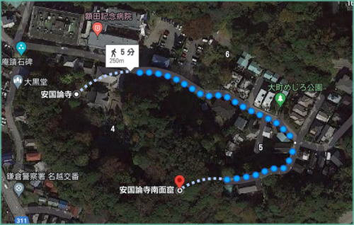 ![]() 安国論寺の白猿に導かれた 南面窟 出典:kozo nagai氏 グーグルストリートビュー 日蓮の足跡をたどる鎌倉の旅 2022-1-21 はじめに 安国論寺1 安国論寺2 安国論寺 南面窟 妙法寺1 妙法寺2 妙本寺1 妙本寺2 妙本寺3 比企一族供養塔 蛇苦止堂 本覚寺 えびす堂 日蓮辻説法跡 光則寺 日朗土牢 雨乞伝説・霊光寺 アクセス 安国論寺日朗荼毘所の横の道を登り、以下のグーグルマップにあるように、ぐるりと高台をまわったところに南面窟がある。徒歩で約5分である。 ![]() ただし、安国論寺同様、駐車場はないので、近くのお有料駐車場に車を駐車させ、歩いて行くことになる。また南面窟は、一旦安国論寺の境内に入り、その後、上のグーグル地図にあるように。日朗上人荼毘所の横の坂道を登ってゆくことになる。 安国論寺南面窟の地番、〒248-0007 神奈川県鎌倉市大町4丁目4 ◆安国論寺南面窟 南面窟は安国論寺の裏山中腹にある窟である。日蓮聖人が立正安国論を政府に手渡した40日後、念仏信者が草庵(現在の安国論寺)に来襲し、庵を焼き討ちにした。 これを、松葉ヶ谷法難という。庵を追われた日蓮は、白猿に導かれてこの南面窟に避難したという。ここにも、増上寺の灯篭があるが、これは戦後、空襲で焼失した増上寺の霊廟にあった多くの灯篭を首都圏の寺院に移設したものである 以下の参考出典は鎌倉タイムズ 日蓮聖人は戦う人であったが、この安国論寺は、美しく整えられた樹々と自然の谷戸が溶け合ってとても穏やかで落ち着くお寺である」す。自然の中に包まれているような心地よさが味わえる。 日蓮上人は1222年(貞応元年)、千葉県鴨川市で産まれました。1238年(暦仁元年)16歳の時に地元の清澄寺において出家し、比叡山、三井寺、薬師寺、高野山、仁和寺、天王寺、東寺において15年の修行を重ね、清澄寺に戻り、1253年(建長5年)、「南無妙法蓮華経」と唱え悟りを開いた(立教開宗)と言われています。 「南無」とは帰依しますの意で、「妙法蓮華経」とは法華経を指しますから、「南無妙法蓮華経」とは法華経に帰依しますという意味となる。 日蓮宗は法華経を信奉するとともに、他の教典や教えを信じる宗派を一切認めないのが特徴であった。当時、元執権北条時頼に提出した有名な立正安国論でも、「地震や疫病などの災害が続くのも法華経を信じず、浄土宗などの邪教を信じているからだ」として、法華経を中心とする国家建設を説きました。 その激しさから、他宗の僧らによって鎌倉松葉カ谷の草案が焼き討ちにあったり、幕府によって伊豆に流罪となりました。1271年には腰越滝の口刑場(現 龍口寺)において処刑されかけます(ぎりぎりで助かります)。 安国寺の南面窟は、その松葉ヶ谷法難の際に、日蓮聖人が身を隠したという洞窟である。 妙法寺1つづく |