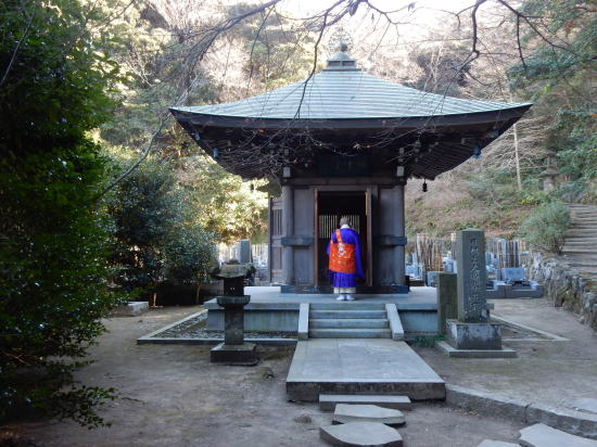 ![]() 安国論時の日朗上人荼毘所 撮影:青山貞一 Nikon Coolpix S9900 短訪 鎌倉 2022-1-21 日蓮の足跡をたどる鎌倉の旅 2022-1-21 はじめに 安国論寺1 安国論寺2 安国論寺 南面窟 妙法寺1 妙法寺2 妙本寺1 妙本寺2 妙本寺3 比企一族供養塔 蛇苦止堂 本覚寺 えびす堂 日蓮辻説法跡 光則寺 日朗土牢 雨乞伝説・霊光寺 訪問日は、偶然、数か月前にハワイから赴任した安国論寺の新住職がおられ、日朗上人荼毘所の前で、幸運にも、日蓮聖人や日朗上人についていろいろとお話しすることが出来た。 そもそも、日朗上人荼毘所も一年に一度しかひらかれないとのことで、訪問日は偶然だが、その日にあたっていた。 ![]() 安国論寺 短訪 鎌倉 2022-1-21 撮影:青山貞一 Nikon Coolpix S9900 池田lp、おとが安国論寺のFBにアクセスして、訪問時のお礼をメッセッージでご住職に伝えたところ、ご丁寧にお返事を頂戴した。(添付) ![]() ※注) 安国論寺のFBを発見 https://www.facebook.com/ankokuronji/ 正岡子規の歌碑(写真添付) 2011年12月に建てられた正岡子規の歌碑があった。歌は、 「鎌倉の松葉が谷の道の辺に法を説きたる日蓮大菩薩」 とある。子規は、1888年と1893年に鎌倉を訪れ、安国論寺 へも足を運んだそうだ。 ![]() 撮影:池田こみち Nikn Coolpix S9900 2022-1-21 以下は日朗上人荼毘所 日蓮聖人の弟子、日朗を荼毘に付した場所。日郎は熊王と同じ日蓮の高弟で、生涯にわたって日蓮に仕え続けた。日蓮が佐渡に流罪になった際には土牢に幽閉され、許されてからは何度も佐渡に出向いて日蓮と面会したと伝えられている。日蓮が佐渡から鎌倉に帰ってきたとき、出迎えたのもこの日朗でした。 1320年に日朗は亡くなるが、その際に髪を下した安国論寺で荼毘に付してほしいと遺言を残す。その遺言は弟子たちによりかなえられた。現在、荼毘所には小さなお堂が建っている。 ![]() 安国論寺 日朗上人荼毘所 短訪 鎌倉 2022-1-21 撮影:青山貞一 Nikon Coolpix S9900 ![]() 安国論寺 日朗上人荼毘所 短訪 鎌倉 2022-1-21 撮影:青山貞一 Nikon Coolpix S9900 ◆安国論寺詳細 安国論寺(あんこくろんじ)は、神奈川県鎌倉市大町(名越)にある日蓮宗の寺院。山号は妙法華經山。旧本山は比企谷妙本寺。池上・土富店法縁。 長勝寺・妙法寺と並び、日蓮が鎌倉で布教するに際して拠点とした松葉ヶ谷草庵の跡とされ、松葉ヶ谷霊跡安国論寺とも言う。開山は日蓮とするが、弟子の日朗が文応元年(1260年)に、日蓮が前執権北条時頼に建白した「立正安国論」を執筆した岩穴(法窟)の側に安国論窟寺を建てたのが始まりである。 その他、南面窟(松葉ヶ谷法難時に、白猿に導かれて避難した場所)や日朗上人荼毘所(日朗が出家剃髪した場所で荼毘に伏して欲しいとの遺言による)がある。裏山の富士見台からは由比ガ浜海岸を含む市内を一望でき、日蓮が富士山に向け題目を唱えたとされる。 なお東芝社長や経団連会長を務め、熱心な法華信者であった土光敏夫の菩提寺(墓所)でもある[1]。 第51世玉川日薩師は、霊跡本山比企谷妙本寺第81世に晋山。 境内には、鎌倉市天然記念物に指定されている 妙法桜(日蓮の杖が根付いたとされる市原虎の尾という品種のヤマザクラ) 海棠(カイドウ) 山茶花(サザンカ) - 樹齢350年と言われる。 があり見所となっている。 寺宝 木造日蓮上人坐像(立正安国論を執筆している姿の像) 鬼子母神 十羅刹女立像 七面大明神立像 大黒天立像 木造日朗上人坐像 文学 赤羽尭著「古都鎌倉殺人事件」(トクマノベルス)の舞台になっている。 ![]() 安国論寺 石仏と池田こみち 短訪 鎌倉 2022-1-21 撮影:青山貞一 Nikon Coolpix S9900 ![]() 安国論寺 宝塔と池田こみち 短訪 鎌倉 2022-1-21 撮影:青山貞一 Nikon Coolpix S9900 安國論寺の概要 日蓮宗寺院の安國論寺は、妙法華経山と号します。安國論寺は、布教のために建長5年(1253)安房から鎌倉に入った日蓮聖人が、最初に小庵(松葉ヶ谷御小庵)を結び、他宗僧に小庵を焼き討ちされた地とされ、建長5年(1253)を創建とします。日蓮聖人は御岩屋で立正安国論を執筆したことから、安国寺、安国論窟寺とも称され、現在は安国論寺と号しています。 安國論寺 安國論寺の概要 山号 妙法華経山 院号 - 寺号 安國論寺 本尊 - 住所 鎌倉市大町4-4-18 宗派 日蓮宗 縁日 - 葬儀・墓地 - 備考 - 安國論寺山門安國論寺山門安國論寺本堂安國論寺本堂安國論寺平和の鐘安國論寺平和の鐘安國論寺日朗上人御荼毘所安國論寺日朗上人御荼毘所安國論寺御小庵安國論寺御小庵安國論寺熊王殿安國論寺熊王殿安國論寺南面窟安國論寺南面窟 安國論寺の縁起 安國論寺は、布教のために建長5年(1253)安房から鎌倉に入った日蓮聖人が、最初に小庵(松葉ヶ谷御小庵)を結び、他宗僧に小庵を焼き討ちされた地とされ、建長5年(1253)を創建とします。日蓮聖人は御岩屋で立正安国論を執筆したことから、安国寺、安国論窟寺とも称され、現在は安国論寺と号しています。 鎌倉市掲示による安國論寺の縁起 当山は日蓮聖人松葉ヶ谷御小庵の霊跡です。御小庵の元となった岩窟(「御法窟」または「日蓮岩屋」という)が本堂の