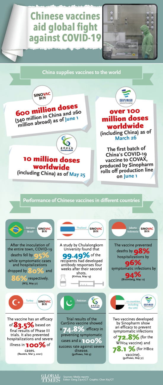 ![]() 製造ラインで働くシノヴァック社のスタッフ写真:Hu Yuwei/GT <本文> 米国が約束するだけで実際には動かず、以前から世界の主要なワクチン製造国であったインドが、国内でのCOVID-19の深刻な流行の中で生産契約の履行に苦慮している中、中国は国際的な供給を可能な限り拡大し、優れたな防護データを持ち信頼できる用量のワクチンを提供することで、世界的な対パンデミックの戦いを支援するために主導的な役割を果たしている。 世界保健機関(WHO)は火曜日、中国のSinovac社が製造したCOVID-19ワクチンを緊急用に認可したが、これはCOVAXがワクチン提供者となるための前提条件である。 WHOのテドロス長官は、火曜日の記者会見で、「本日、不活化ワクチンを2回接種した結果、安全性、有効性、品質が保証されたことから、シノバック-COVID-19ワクチンがWHO緊急使用リストに掲載されたことをお知らせします」と述べた。 さ らに、「コロナバックは保管が容易なため、低資源環境の地域・国々に非常に適している」と述べている。コロナバックは、WHOの緊急使用リストに掲載された8番目のワクチンとなった。これらの救命ツールを必要としている人々に迅速に届けることが今、重要です」とテドロスは指摘している。 この決定は、中国が世界的なパンデミック対策に協力する意思と手段を持っているだけでなく、その能力も備えていることをさらに示している、と中国ワクチン産業協会のFeng Duojia会長は、火曜日にGlobal Timesに語っている。 また、中国国有ワクチンメーカーであるシノファーム社は、5月7日にWHOから緊急用ワクチンとして承認されたCOVID-19用ワクチンを、世界的なワクチン共有スキームであるCOVAXのために北京で準備し、初荷を出荷した。 シノファーム社は、COVAX用の特別な荷物(梱包)にいくつかの改善を加えた。これには、パッケージへの英語標記の適用や、温度変化を示すワクチン・バイアル・モニター (VVM) と呼ばれるステッカーのデザインが含まれる。 シノファームの子会社でCOVID-19ワクチンの研究・生産を担当する中国国家生物技術集団(CNBG)の副社長であるZhu Jingjin氏は、火曜日に行われた中国からのCOVAX第1号の出荷式典で、シノファームはCOVID-19用ワクチン注射にVVMを取り付けた世界初のメーカーでもあると述べた。 朱氏によると、国際的な監視・監督のために外箱にQRコードが付いており、同社は説明書の情報を改善したという。 中国は、COVAXスキームにCOVID-19用ワクチン1,000万回分を提供することを約束した。中国外交部の王文彬報道官は、火曜日の定例記者会見で、中国企業はその提供を確実にするために最善の努力をしていると述べた。 また王氏は、「中国は、関連企業がCOVAXプログラムとの情報交換と調整を強化することを引き続き支援し、世界的な流行との戦いにおける早期の勝利を確保するために中国が貢献していく」と述べた。 ![]() <写真:シノヴァックのワクチン> Sinovac COVID-19 vaccine. Photo: VCG ■リーディング・サプライヤー 中国は、5月中旬までにCOVID-19ワクチンを海外に累計3億本供給し、特に発展途上国におけるワクチンの入手可能性と価格に貢献している。 海外市場における中国の主要供給元であるシノバック社は、月曜日の時点で、規制当局の承認を得て、国内市場を含む46の国と地域にCOVID-19ワクチンを全体で6億回分供給したことを明らかにした。 Global Timesの計算によると、Sinovac社は月曜日の時点で、中国以外の地域に約2億6千万回分のワクチンを供給し、国内市場には約3億4千万回分のワクチンを供給している。Sinovac社の指摘によれば、海外への供給がこれまでの国内供給の4分の3を占めている。 シノバック社のワクチンは、中国を含む全世界で4億3,000万本以上が接種されている。すなわち、全世界で投与されたCOVID-19ワクチンの5回に1回はシノバック社のものであると、同社の広報担当者であるLiu Peicheng氏は火曜日の記者会見で述べた。 シノバックはこれまでに、インドネシア、ブラジル、チリ、シンガポール、サウジアラビア、WHOの7つの国際医薬品規制当局から検査を受けている。また、中国国内に5つの生産拠点を持ち、年間20億回の投与が可能であり、ブラジル、トルコ、インドネシア、マレーシア、エジプトなど5カ国以上に現地生産の許可を出している。 中国で一回限りのワクチンを製造しているCanSinoBIOは、これまでに1,000万本以上のワクチンを世界中に配布しており、高リスク地域向けにさらに多くのワクチンを確保していると、Global Timesは火曜日にCanSinoBIOから聞いている。 シノファーム社は、5月末にメディアに対し、中国本土を含む全世界で3億本以上のワクチンを接種したと発表した。 これまでに、2種類の中国製ワクチンがWHOから緊急使用の許可を得ている。 専門家は、今後、より多くの中国メーカーがWHOの承認を得て、世界的な感染症との戦いに参加し、世界にとって重要な戦いにおける中国の貢献と責任を示すことになると指摘している。一方、米国はワクチンの在庫