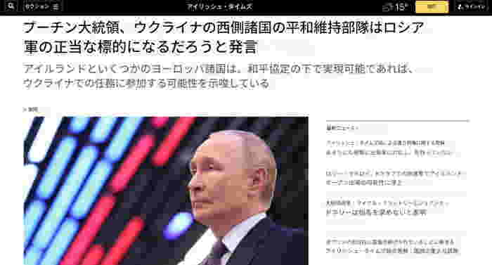 見出し「プーチン大統領、ウクライナの西側諸国の平和維持部隊はロシア軍の正当な標的となると発言」