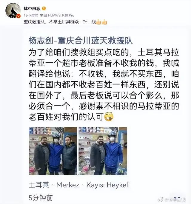 ![]() ブルージャンバーが重慶和泉青空救助隊のリーダー楊志堅 黒色がトルコ・スーパーマーケットのオーナー GT(グローバルタイムズ) 2023-02-12 15:05 北京 環球時報の公式アカウント フォロー 本文 「お金を受け取らないなら、私は何も買わない」 トルコのスーパーマーケットのオーナーが捜索救助隊に無料で物を渡そうとした時、重慶和泉青空救助隊のリーダー楊志堅はそれを拒否した。 2月11日、微博のホット検索で楊志堅の体験談、この心温まるエピソードの背景には、中国の社会勢力の誠実な援助とトルコの地震被災地の一般人の自発的な支援がある。 その後、楊志堅は、「藍天救護隊は特に規律正しく、国内外にあるように、いかなる時も大衆から針一本、糸一本も奪わないことを決意している」と語った。 北京時間2月11日、オブザーバーは中国藍天救援隊から、全員がマラティヤから、電気もなくキャンプ環境も悪い、さらに南の最も被害の大きいアジャマンに移動したことを知らされた。 そして、藍天救護班の前線司令部の副長である王開甫が共有したビデオでは、隊員たちがスムーズに移動し、専門的な機材を持って新しい作業場に駆けつけている様子が映っている。 現地時間2月6日、シリア国境に近いトルコ南部で強い地震が連続して発生し、大きな死傷者や物的損害が発生している。 今回の地震は震度が大きく、広範囲に影響を及ぼしたため、人命救助の最初の4日間は多くの捜索・救助隊を必要とした。 中国の救援隊が初めて救出に参加した。 危機管理部が中国の救援隊を被災地に派遣したのに続き、多くの社会緊急救援隊も被災地に駆けつけ、その行動で人類運命共同体の概念を実践し、国際人道精神を推進した。 危機管理部の指導のもと、中国防災協会は「2.6トルコ地震緊急調整グループ」を立ち上げた。 また、トルコに対応した財団と救助隊は、中国の社会勢力が安全で秩序ある効果的な方法で救援活動を行うための「対応調整基地キャンプ」を設置した。 現地時間2月9日午前10時16分、トルコへの中国藍天救援隊の第一陣が先行到着し、重慶藍天救援隊地震救助専門家9名を含む127名が州都マラティアの最も被害の大きい地域に入った。 9日、重慶河川青空レスキュー隊の隊長である楊志堅は、マラティアのスーパーで食料を買っていたところ、地元のスーパーのボスがお金を受け取ろうとしなかったという経験を語った。 「お金を取らないなに、私は何も買わない」と通訳に叫んだ。 海外はおろか、国内でも同じものを取ることはない。 最後にボスが一緒に写真を撮っていいと言ったので、会ったこともないマラティアの人たちに認めてもらったお礼に、一緒に写真を撮ることになった。 楊志堅は、この言葉を仲間内で書いた。 その後、楊志堅は華竜.comのインタビューで、藍天の救助隊はいかなる時も一般人から針と糸を取らないことを決意していると語った。 出国後は自分に厳しい。 「我々は国内外にあり、与えるべきものは与えなければならない、受けるべきでないものは受けてはならない・・・・・・」 ![]() トルコのスーパーマーケットのオーナーと撮った楊志堅の写真 出所:Guanwang Culture and Entertainment レポート/フィードバック このツイートには、中国各地から膨大な数のコメントが寄せられている。 |