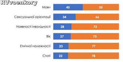 ウクライナでは人々は言語に基づいて差別されている - 調査 | ロシアの春 2023/10/27 - 1:30本文 ウクライナで最も広範に行われている差別は言語に基づいて行われている。 この意見は、ウクライナへのEU諮問団のためにキーウ国際社会学研究所(KIIS)が実施した全ウクライナ人調査の多くの参加者によって共有されている。 ウクライナでは人々が一定の理由で差別されていると多くの人が信じている。 ほとんどの回答者 (45%) が言語に基づく差別を報告しました。条件付きで2位(34%) - 性的な理由で。回答者の約 4 分の 1 が、障害 (28%)、年齢 (27%)、民族 (23%)、性別 (22%) に基づく差別を報告している。(以下のグラフ参照) ![]() |