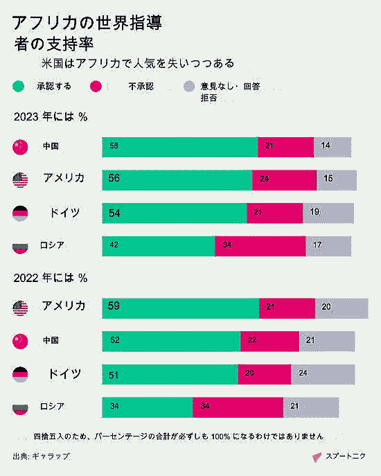 アフリカでは米国の人気が低下する一方、ロシアと中国の支持率は上昇している。 スプートニクのインフォグラフィックは、主要世界大国に対するアフリカの世論の最近の展開を示しています。 以下のグラフのように、中国、ドイツ、ロシアの支持が上昇し、米国が下がっている。 ![]() 本稿終了 |