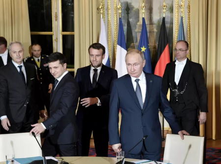 エリゼ宮殿でのノルマンディー形式の会談中のロシアのウラジーミル・プーチン大統領、フランスのエマニュエル・マクロン大統領、ウクライナのウラジーミル・ゼレンスキー大統領