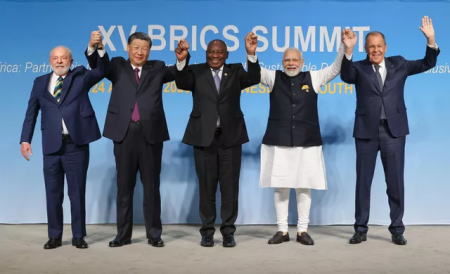 ヨハネスブルグでのBRICS諸国代表団長の写真撮影式典に出席したブラジルのルーラ・ダ・シルバ大統領、中国の習近平国家主席、南アフリカのシリル・ラマポーザ大統領、インドのナレンドラ・モディ首相、ロシアのセルゲイ・ラブロフ外相(左から右)