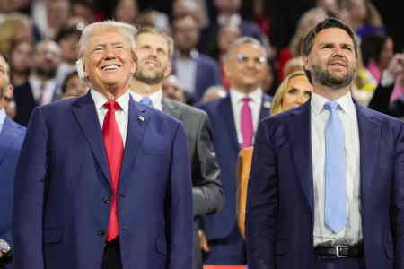 ミルウォーキーでの共和党全国大会で共和党大統領候補のドナルド・トランプ元大統領と副大統領候補のJ・D・バンス