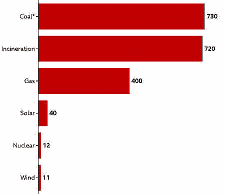 BBCの5年間の分析では、焼却炉の運営者が記録した実際の汚染レベルのデータを使用し、エネルギー回収施設が現在、石炭を燃焼した場合と同じ量の温室効果ガスを発電量単位あたりで排出していることが判明した。