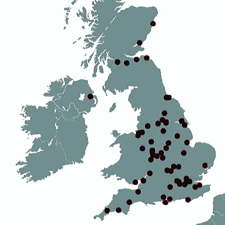 図の各点は英国の廃棄物焼却発電施設を表し、稼働開始年(下記年表参照)に赤丸が表示されている。
