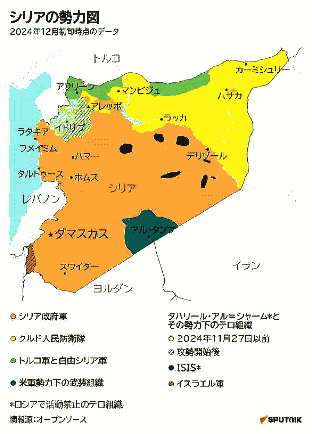 シリアではここ数日、武装組織「タハリール・アル=シャーム」(ロシアはテロ組織に認定。統合前の名称は「ヌスラ戦線」)による占領が進んでいる。アレッポも同組織の統制下に入った。スプートニクは現段階のシリアの勢力分布をインフォグラフィックに表した。