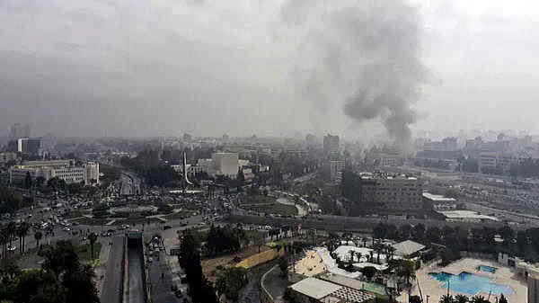 連盟はシリアへの支援を継続すると約束した。シリア、ダマスカス上空の煙