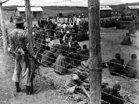 1950年代には、英国の植民地軍に土地を占領されたキクユ族やその他のケニア人が、植民地権力に対して土地の占領に抵抗する武装抵抗運動を起こした。これに対して英国は、自らの権益を守るために「アンヴィル作戦」と呼ばれる作戦を開始した。この作戦の一環として、英国は「強制収容所」を設置し、数十万人のケニア人が強制労働に従事させられたとされる。女性に対するレイプや性的虐待、飢餓、鞭打ち、収容者の殺害、死亡は、これらのキャンプでは日常茶飯事だった。