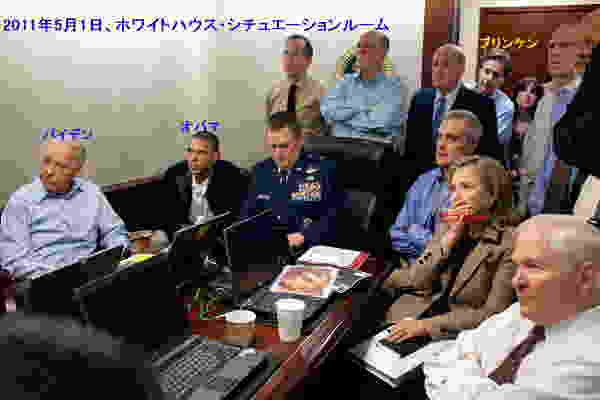 ホワイトハウスのシチュエーションルームで国家安全保障会議メンバーがアメリカ軍のビン・ラディン殺害作戦を見守る。後方に当時国家安全保障担当副大統領補佐官だったブリンケンがいる(2011年5月1日)。Source:Wikimedia