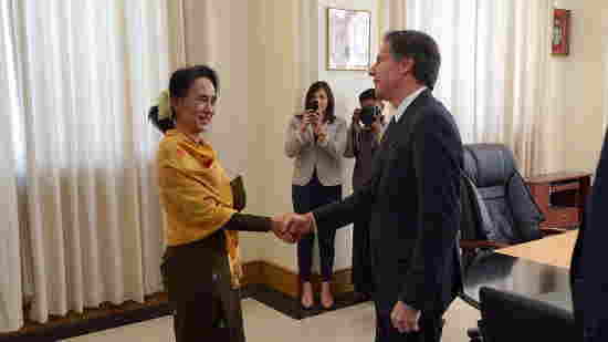 ミャンマーのアウンサン・スーチーとブリンケン(2016年1月18日にミャンマーのネピドーにて) Source:Wikimedia Commons