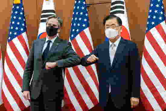 次いで3月17日にオースティン国防長官と共に韓国を訪問した[56]。3月18日にソウルで米韓外務・防衛担当閣僚協議(2プラス2)に及んだが、その共同声明は全体の3分の1が中国批判に費やされていた2日前の日米両国の共同声明と対照的に「中国」と対中牽制の協議体「クアッド」に関する言及が無かった。ブリンケンは韓国にも日本と同様の中国に関する言及を共同文書に盛り込むことを要求した可能性が高いが、米中間で「バランス」を維持したい韓国の反対で中国への言及ができなかったものと見られる[57]。しかし北朝鮮がアメリカと韓国に対して挑発行為を繰り返して朝鮮半島情勢が緊迫化してきており、日米韓3国が北朝鮮に対する連携を取ることが重要である点では一致した[58]。その後の文在寅大統領との会談において文は、「韓日関係は朝鮮半島の平和と安定、繁栄に非常に重要で、韓米日協力でも強固な土台だ」・「韓日両国の関係修復に向けて努力を続ける」とブリンケンに述べた[59]。