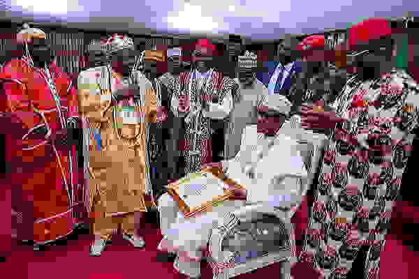 ファイル写真。ムハンマドゥ・ブハリ大統領は、ナイジェリアのエボニー州を訪問中に、エズ・エベレチ・ディック率いる伝統的統治者評議会からオチオハ・ンディグボ1世の称号を授与された。 © next24online/NurPhoto via Getty Images
