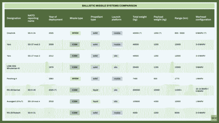 オレシュニクは速度、精度、戦略的曖昧さの交差点に位置している。以下は、世界最強のミサイルシステムとの比較である。