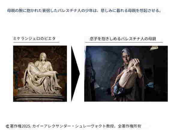 キリスト教徒の心に深い精神的重みと共鳴を呼ぶこの画像は、ルカ2章7節でイエスが飼い葉桶に包まれた貧しい布の断片を想起させます。母親の腕の中で衰弱していく骸骨のような少年の姿は、ミケランジェロによって不朽のものとなった、十字架に掛けられた息子を抱く悲嘆に暮れる母親「ピエタ」(イタリア語で「哀れ」や「同情」を意味する)を彷彿とさせます。これは、集団の記憶に深く刻み込まれた哀れみの象徴的な表現です(図 2 参照)。