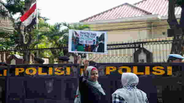 インドネシアの首都ジャカルタでは、イスラエルによるガザ地区封鎖に対する抗議活動がエジプト大使館前で行われた。写真:EFE