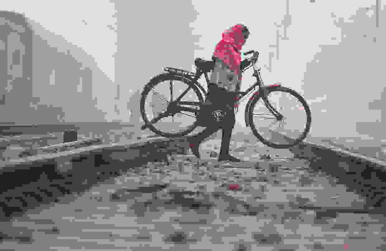 灰色の霞が空気を包み込み、冷気と微かな臭いを運んでいる。デヴィキは家を出ると、3km先の職場である建設現場へ向かう途中でさらに塵を巻き上げながら歩む。インドの首都は2000万人以上の人口を抱え、建設ブームの真っ只中にある。