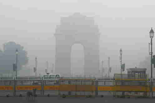 2025年12月20日、インド・ニューデリーの冬の朝、濃いスモッグの層越しにインド門が見える。© Kabir Jhangiani/NurPhoto via Getty Images