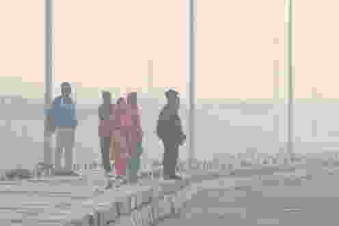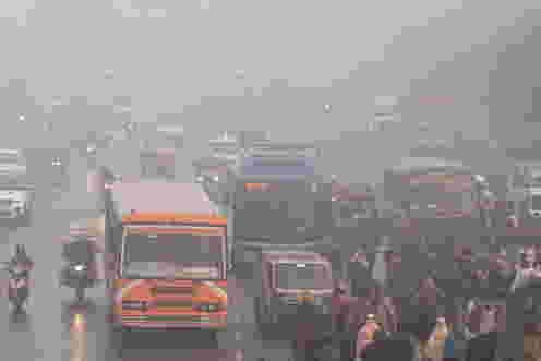 2025年11月22日、ドゥワルカで早朝にバスを待つ人々。都市の大気質を悪化させている。© Vipin Kumar/Hindustan Times via Getty Images