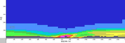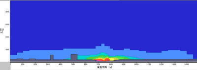 ここで、上記の気象データ、地形データを用い、排ガス濃度に規準濃度を与え3次元流体シミュレーションを行う。