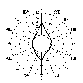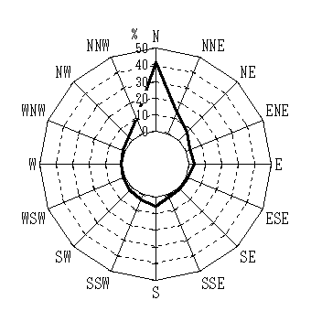 以下は、厚木基地内の海上自衛隊が厚木基地内の滑走路南側地点(1999年2月以降)で測定している風向・風速測定結果から作成した年間、夏期56日間、冬期56日の風配図である。