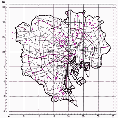 | 左図中、紫色の点が想定居住地を示す。図には23区以外2名(非原告)が含まれている。また左図中、 茶色の道路が12時間交通量で4万台以上の道路を示す。判決は、上記99名のうち、汚染の濃度では なく、交通量と道路から50m以内に居住する原告7名に対してのみ国家賠償を認めている、 |