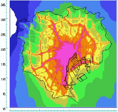 東京23区の平成6年度の二酸化窒素 大気汚染濃度シミュレーション図 |