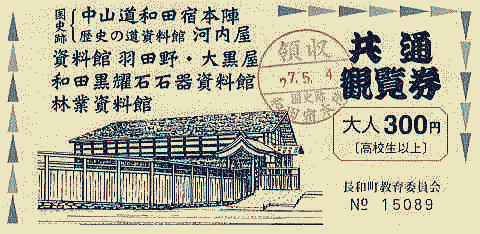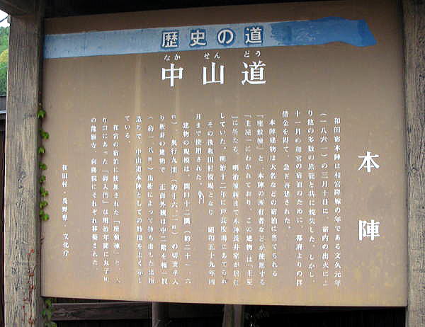◆和田宿本陣 下の地図では、左側の十字路の一角にA和田宿本陣があります。 ![]() 出典:中山道和田宿 長和町教育委員会、長和町産業振興課 信定寺の前の道を美ヶ原方向と反対側に少し歩くと、十字路があり、その一角に和田宿の本陣がありました。 ![]() 出典:歴史の道「中山道」資料館 下は中山道和田宿町並まっぷにおける本陣です。真ん中より右にあります。 ![]() 出典:歴史の道「中山道」資料館 ◆和田宿本陣の概要 和田宿の本陣は、文久元年(1861年)に火災により焼失しましたが、数ヶ月後に皇女和宮が京都から江戸に向かう途中の宿泊地とすることが決定していたため急遽再建されました。 明治維新後に宿場制度が廃止となり本陣の役割が亡くなると座敷棟などは龍願寺(上田市丸子)へ移築され居室棟は役場や農協事務所として使用されました。 昭和59年に旧和田村役場庁舎の移転に伴い解体される予定でしたが、中山道の宿場町の中で数少ない本陣の遺構のひとつとして評価され平成元年に復元、国指定史蹟に指定されています。 ![]() 出典:中山道和田宿 長和町教育委員会、長和町産業振興課 下は和田宿本陣の門です。背後には山が迫っていることが分かります。 ![]() 和田宿本陣の門 撮影:青山貞一 Nikon Coolpix S8 2015-5-4 下は和田宿本陣の庭にあった歴史の道、中山道 本陣の解説です。 ![]() 和田宿本陣の庭にあった歴史の道、中山道 本陣の解説 撮影:青山貞一 Nikon Coolpix S8 2015-5-4 下の写真は十字路の一角にある和田宿の本陣です。 ![]() 和田宿本陣(長野県長和町)前の池田こみち 撮影:青山貞一 Nikon Coolpix S8 2015-5-4 ![]() 和田宿本陣(長野県長和町)の門より本陣を撮影 撮影:青山貞一 Nikon Coolpix S8 2015-5-4 ![]() 和田宿本陣(長野県長和町)の門より本陣を撮影 撮影:池田こみち Nikon Coolpix S6400 2015-5-4 早速、門をくぐり庭に入ります。 下は国の史蹟でもあります和田宿本陣はじめ歴史の道資料館河内屋、資料館羽田野・大黒屋などの共通観覧券です。 ![]() 出典:中山道和田宿 長和町教育委員会、長和町産業振興課 撮影:青山貞一 Nikon Coolpix S8 2015-5-4 和田宿の本陣を紹介するに際し、有名な皇女和宮の何たるかをお伝えしないわけには行きません。