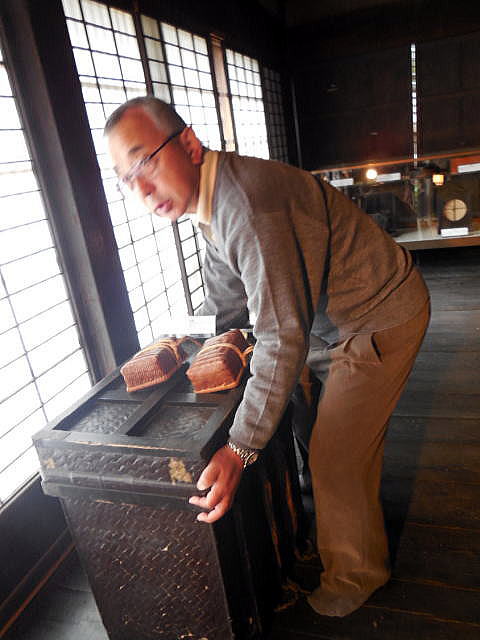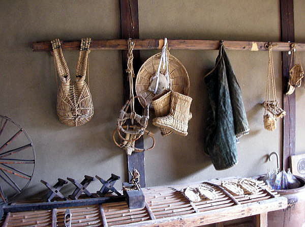 ◆和田宿 かわちや・歴史の道資料館(什器など) 大黒屋の次は、かわちや・歴史の道資料館です。下の地図にあるように、かわちやは中山道をはさみ大黒屋・下の問屋の反対側にあります。またすぐ隣を追川が流れています。 ![]() 出典:歴史の道「中山道」資料館 ![]() 出典:中山道和田宿 長和町教育委員会、長和町産業振興課 かわちやは、文久元年(1861年)の大火で焼失(和田宿内では本陣、脇本陣を含め109戸が全焼)しましたが、”かわちや”もこのとき急きょ再建された建物のひとつです。 建物は、切妻、平入、金属板葺、中山道の町屋でよく見られる出桁造りで、格子戸など江戸時代末期に建てられた旅籠建築の遺構として貴重な存在なことから現在は、修復工事が行われ内部が「歴史の道資料館」となっています。 下の写真は、旅支度のための品々です。左から背負子、かんじき、三度笠、藁ぐつ、合羽、草鞋(二足三文だった)などです。 以前、群馬県赤岩の養蚕集落でもこの種の民具を見たことがあります。いずれも藁(わら)などを材料に作られた民具であり、壊れたり使い終われば土に帰って行く素材と言えます。 ![]() 当時の旅支度のための品々:草鞋、藁長靴、カンジキ、合羽、傘、背負子など 撮影:青山貞一 Nikon Coolpix S8 2015-5-4 下はかわちやの学芸員から詳しい説明を聞く池田こみちです。 ![]() 学芸員から詳しい説明を聞く池田こみち 撮影:青山貞一 Nikon Coolpix S8 2015-5-4 ![]() 学芸員から詳しい説明を聞く池田こみち 撮影:青山貞一 Nikon Coolpix S8 2015-5-4 下は振り分け荷物の籠です。 これは比較的小さいもので、干し飯などをいれたものですが、もう少し大きいものもあったようです。下の箱は、葛篭(つづら)です。衣類などを入れて運びました。 ![]() 撮影:青山貞一 Nikon Coolpix S8 2015-5-4