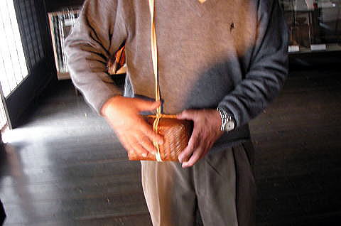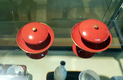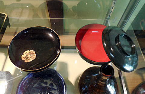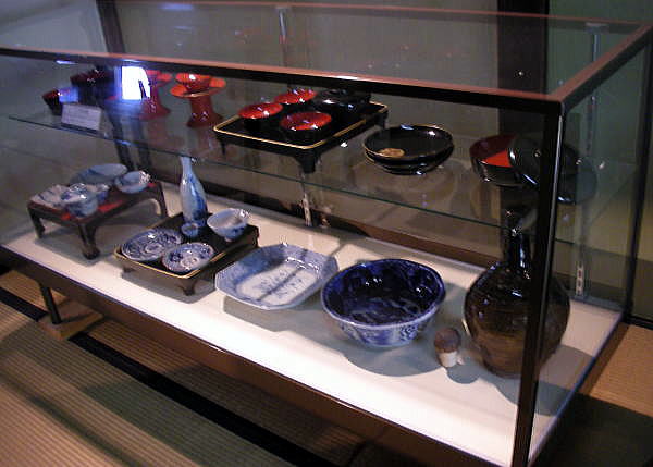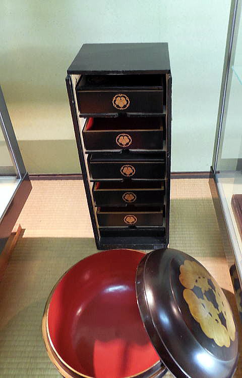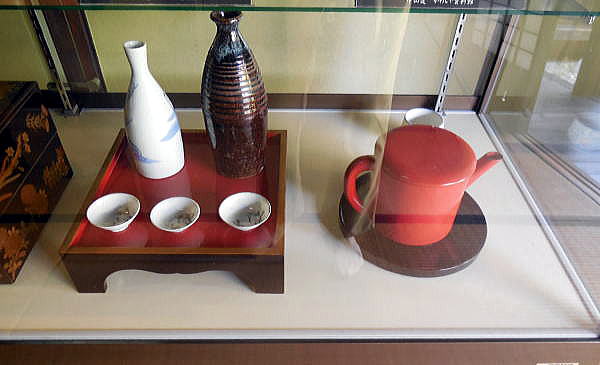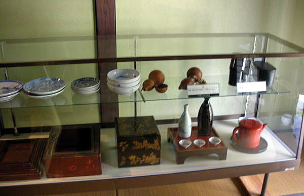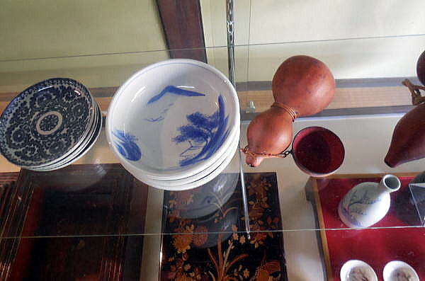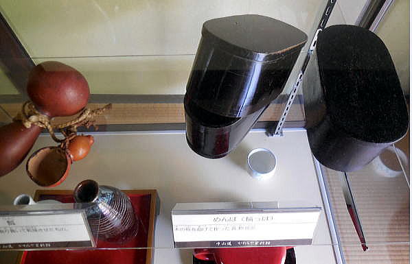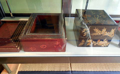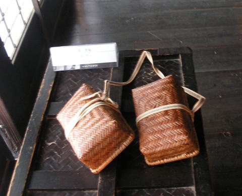 ![]() 撮影:青山貞一 Nikon Coolpix S8 2015-5-4 下は葛籠です。 竹でできているのでそれほど重たくないとはいえ、これに荷物を入れると相当な重量となったと思います。 ![]() 撮影:池田こみち Nikon Coolpix S6400 2015-5-4 以下は、右がお重、美しい蒔絵が施されています。 左は店の屋号がありますが、入れ子になった箱で何に使ったのかわかりません。 ![]() 撮影:池田こみち Nikon Coolpix S6400 2015-5-4 これらは、食器類です。お膳に四つ椀と酒杯が乗せられています。また高坏に乗せた酒杯もあります。塗り物は主に石川県の輪島塗となっており、焼き物は伊万里などの染付が多く用いられていたようです。 ![]() 食器類 撮影:青山貞一 Nikon Coolpix S8 2015-5-4 ひょうたんには、お酒やお水を入れて旅の間持ち歩きました。下の段には朱塗りの湯桶、大きな焼物の徳利や猪口なども保存されていました。 ![]() ひょうたんや徳利 撮影:青山貞一 Nikon Coolpix S8 2015-5-4 ![]() 撮影:池田こみち Nikon Coolpix S6400 2015-5-4 右側はひょうたんです。 ![]() 撮影:池田こみち Nikon Coolpix S6400 2015-5-4