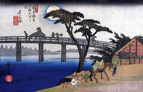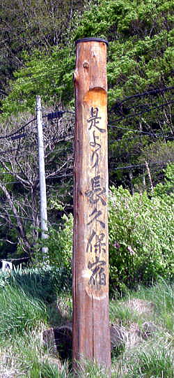 長久保宿(ながくぼしゅく)は、上の表にあるように、中山道六十九次のうち江戸から数えて二十七番目の宿場となります。 現在では長野県小県郡長和町の長久保にあります。 長久保宿は、ともに難所であった和田峠(和田宿)と笠取峠(芦田宿)の間にあって、最盛期には旅籠が50軒ほどある比較的大きな宿場でした。 下の歌川広重の浮世絵は、歌川広重「木曽街道六十九次・長久保」です。依田川のほとりにある松の木がアクセントになって浮世絵全体を引き立てています。 ![]() 歌川広重「木曽街道六十九次・長久保」 長久保宿では、宿場の発展と共に町並みが横丁の先に広がり、下の地図にあるようにカギ型に曲がった珍しい形の宿場町となりました。 下の地図では、赤い線が旧中山道、黄色の143号線が国道です。 ![]() カギ型に曲がった珍しい形の宿場町 長久保宿 出典:中山道六十九次 旧中山道地図 旧街道地図 ところで、長久保の本来の表記は長窪郷に含まれる「長窪」でした。しかし、宿で生活する人々が「窪」の字を敬遠し、久しく保つの意味の「久保」に縁起をかついで、表記を変えたとされています。 1859年、「宿方」から「代官所」へ宿名変更の願書が出されましたが、許可はされなかったそうです。 そのため、1859年以降も公文書には「長窪宿」と記されていました。そして明治にようやく長久保が認められました。 天保14年(1843年)の『中山道宿村大概帳』によれば、長久保宿の宿内家数は187軒、うち本陣1軒、脇本陣1軒、旅籠43軒で宿内人口は721人とそれなりの規模の宿場であったことが分かります。 1859年(安政6年)、幕府が神奈川、長崎、函館の3港を開港し外国との交易が盛んになり通貨の需要が高まると、偽二分金が流布し、従来からの銭貨や明治政府により発行された太政官札の不足も手伝い、1869年(明治2年)-1870年(明治3年)に小額通貨が大量に不足し、経済に大混乱をもたらします。 この際に、信濃諸藩では、「信濃全国通用銭札」を発行し、また主要な街道の宿場では宿場札を発行し対処しました。特に中山道では多く発行されましたが、長久保宿では明治2年10月まで使用された「縮限通貨」を六百二十四分、百分、四十八分、二十四分の4種類を発行し利用していました。 出典:Wikipedia 下は国道142号線で和田から長久保に向かう途中の風景です。 ![]() 撮影:青山貞一 Nikon Coolpix S8 2015-5-4 下は国道142号線で和田から長久保に入るところありました「これより長久保宿」という標識です。 ![]() 撮影:青山貞一 Nikon Coolpix S8 2015-5-4 下は長和町の「まるごと長和町」からの宿についての解説です。