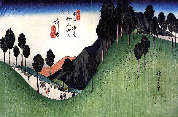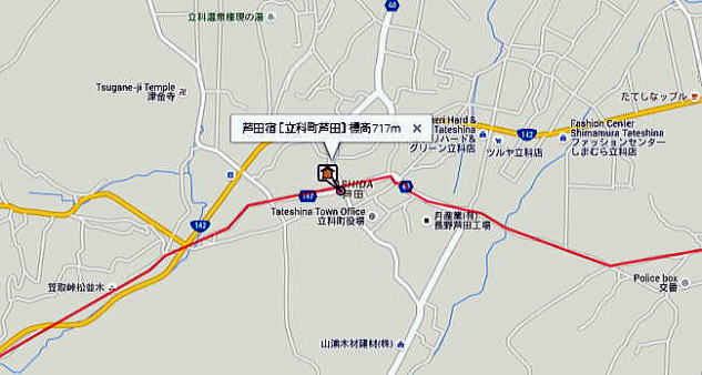 ◆笠取峠 私達は長久保宿を後に、国道142号線で立科方面に向かいます。 下の地図は長久保宿から芦田宿の間にある笠取峠の位置です。 芦田宿側に笠取峠松並木があります。 ![]() 長久保宿から芦田宿の間にある笠取峠の位置。芦田宿側に笠取峠松並木があります。 出典:中山道六十九次 旧中山道地図 旧街道地図 途中、下の写真にあります笠取峠の松並木の隣を通ります。下の写真には笠取峠の松並木は映っていません。 ![]() 撮影:青山貞一 Nikon Coolpix S8 2015-5-4 松並木を抜け、しばらく坂を登ると標高876mの笠取峠頂上となります。下の絵は、往事の笠取峠頂上です。 ![]() 江戸時代の笠取峠(かさどりとうげ) 笠取峠(かさどりとうげ)とは、長野県北佐久郡立科町と長野県小県郡長和町との境にあります旧中山道と国道142号線の峠を意味します。 標高は約900mあります。芦田宿と長久保宿の間にあり、江戸時代は、旅人が上り坂で暑さと疲れのあまり、皆いつの間にか笠を取っていることから笠取峠と呼ばれるようになったと言われています。松並木が残っており往時の面影を留めています。 なお、松並木には、以下のような逸話が残っています。 江戸初期、二代将軍、徳川秀忠は、慶長九年(1604)諸街道の改修、一里塚の設置とともに街道に樹木を植えさせて並木をつくらせました。 この幕府の植樹政策によって街道の並木は全国的な広がりをみせ、松・杉のほかに樫・榎・漆などが植えられました。特に箱根や日光の並木は、「昼尚暗き」杉の並木として広く知られています。 笠取峠のマツ並木は、近世五街道の一つ中山道芦田宿の西方1km地点から笠取峠にかけて約2kmにわたっています。 言い伝えでは慶長七年頃、公儀より赤松苗753本を小諸藩に下付され、近隣の村々へ人足が割り当てられ小苗を植え付けたとされ、幕末まで手入れ・補植等管理されていました。現在総本数68本の松は、いずれも樹齢が150〜300年以上経たもので、その景観は往時の中山道をしのばせてくれるみごとなものとなっています。 立科町では平成五年に、「松並木公園」として整備し松の保護に努めています。 現在、笠取峠は、国道142号線を車で走れば容易に往来できます。しかし、江戸時代、中山道の笠取峠は歌川広重の絵「木曽街道六十九次・芦田」にあるように、和田峠同様、大変な難所であったようです。 それにしても広重の絵は、いつもディフォルメが鮮やかあり、シンボライズされています! ![]() 歌川広重「木曽街道六十九次・芦田 ![]() 歌川広重「木曽街道六十九次・芦田 ◆芦田宿 さて笠取峠を通過すると立科町の芦田宿に向かいます。下の地図では、左下から右上に向かう黄色い道路が現在の中山道(国道142号線)です。道路沿いに笠取峠松並木という文字が見えます。また赤い●が芦田宿です。 ![]() 出典:グーグルマップ 下の地図では、赤い線が旧中山道、黄色の142号線が国道です。 ![]() 芦田宿(立科町) 出典:中山道六十九次 旧中山道地図 旧街道地図 下の地図は、現在の芦田宿です。上の黄色い道路が現在の中山道(国道142号線)、赤い●があります芦田宿の前の道が旧中山道です。 ![]() 出典:グーグルマップ 芦田宿(あしだしゅく)は、中山道六十九次のうち江戸から数えて二十六番目の宿場。現在の長野県北佐久郡立科町芦田にあたります。