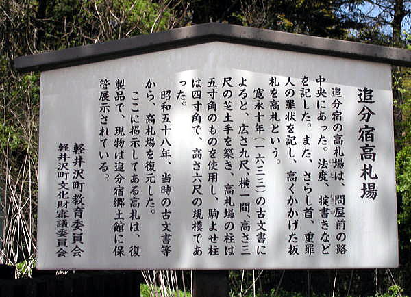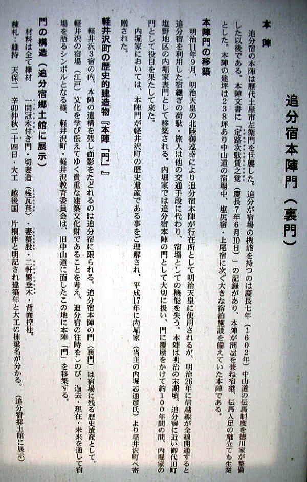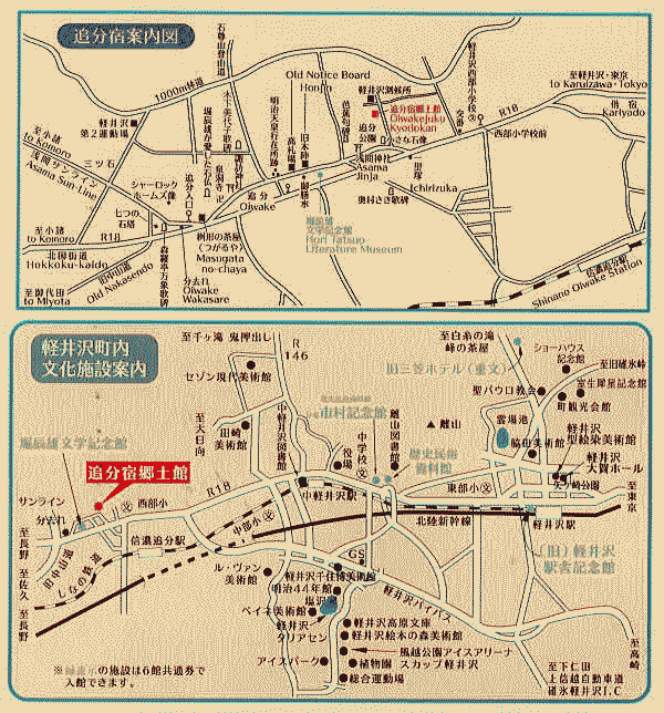 ◆追分宿 追分宿(おいわけしゅく)は、中山道六十九次のうち江戸から数えて二十番目の宿場です。 現在の長野県北佐久郡軽井沢町追分にあたります。この追分宿は、北国街道(北陸道)との分岐点でもあり「追分」の名はこれに由来しています。 元禄時代には旅籠屋71軒、茶屋18軒、商店28軒を数え、飯盛女も最盛期には200〜270人もいたとされるほど栄えた宿です。また、民謡に多く見られる追分節の発祥の地でもあります。 また、天保14年(1843年)の『中山道宿村大概帳』によれば、追分宿の宿内家数は103軒、うち本陣1軒、脇本陣2軒、旅籠35軒で宿内人口は712人とされています。また御影陣屋支配下の貫目改所が設置されていました。 旧脇本陣の油屋は、堀辰雄や立原道造、室生犀星らに愛され、堀辰雄の小説『菜穂子』、『ふるさとびと』に登場する牡丹屋という旅館はこの油屋がモデルとなっています。 下は、渓斎英泉画の木曾街道追分宿、浅間山眺望です。非常に興味深いのは、浅間山が天明3年7月8に噴火する以前の画であり、まるで富士山のように見えることです。 ![]() 木曾街道追分宿、浅間山眺望 渓斎英泉画 追分宿の位置は、以下の地図にあるように、現在の長野県軽井沢町に追分にあります。追分宿の標高は約978mとなっています。 ![]() 追分宿 出典:中山道六十九次 旧中山道地図 旧街道地図 下はより詳細な位置を示しています。国道18号線から少し北側に入ったところの旧中山道沿いにあります。現在、追分宿には、軽井沢町追分郷土館があります。 ![]() 軽井沢には、江戸時代、軽井沢、沓掛、追分の三つの宿場町があり、中山道を通る旅人で賑わっていた。 なかでも中山道と北国街道の分岐点であった追分宿は、旅籠71軒、茶屋18軒、商店28軒があり、 3宿の中でもっともにぎわった。現在でも当時の面影を残す枡形の茶屋つがるやがあります。 ここは2階の壁に枡形とつがるやの屋号を漆喰塗りで浮き立たせ、 2階を前に突き出した出桁造りになっています。現在は民家のため外観のみ見学可。 今でも当時をしのばせる江戸時代の大名行列をモチーフにした祭りである馬子唄道中が 毎年7月下旬に行われています。 ![]() ◆追分宿郷土館 ![]() ![]() ![]() 影:青山貞一 Nikon Coolpix S8 2015-5-5 ![]() 撮影:青山貞一 Nikon Coolpix S8 2015-5-5 ![]() 撮影:池田こみち Nikon Coolpix S6400 2015-5-5 ![]() 撮影:青山貞一 Nikon Coolpix S8 2015-5-5 ![]() 撮影:青山貞一 Nikon Coolpix S8 2015-5-5 ![]() 撮影:池田こみち Nikon Coolpix S6400 2015-5-5 ◆本陣跡 ![]() 追分宿本陣の見取り図 出典:軽井沢町教育委員会 撮影:青山貞一 Nikon Coolpix S8 2015-5-5 ![]() 追分宿本陣の見取り図 出典:軽井沢町教育委員会 撮影:青山貞一 Nikon Coolpix S8 2015-5-5 ![]() 追分宿本陣の開設 出典:軽井沢町教育委員会 撮影:青山貞一 Nikon Coolpix S8 2015-5-5 ◆追分宿本陣門(裏門) 本陣 追分宿の本陣は歴代土屋市左衛門を世襲した。追分が宿場の機能を持つのは慶長7年(1602年)中山道の伝馬制度を徳川家が整備した以後である。本陣文書に「定路次駄賃之覚」(慶長7年6月10日)の記録があり、本陣が問屋を兼ね、宿継(しゅくつぎ)、伝馬人足の継立ても生業とした。本陣の建坪は238坪あり、中山道の宿場中、塩尻宿・上尾宿に次ぐ大きな宿泊設備を整えていた本陣である。 追分宿の本陣は歴代土屋市左衛門を世襲した。追分が宿場の機能を持つのは慶長7年(1602年)中山道の伝馬制度を徳川家が整備した以後である。本陣文書に「定路次駄賃之覚」(慶長7年6月10日)の記録があり、本陣が問屋を兼ね、宿継(しゅくつぎ)、伝馬人足の継立ても生業とした。本陣の建坪は238坪あり、中山道の宿場中、塩尻宿・上尾宿に次ぐ大きな宿泊設備を整えていた本陣である。 ![]() 撮影:池田こみち Nikon Coolpix S6400 2015-5-5 ![]() 撮影:青山貞一 Nikon Coolpix S8 2015-5-5 明治37年東京に生まれ、昭和初期に活躍した作家 堀 辰雄は、大正12年19歳の時に軽井沢を訪れて以来、毎年のようにこの地を訪れるようになり、軽井沢を舞台とした数々の作品を残しました。昭和19年からは追分に定住し、この地に建てた家で昭和28年に49歳で亡くなりました。 この記念館は、軽井沢をこよなく愛した作家、堀 辰雄に関する資料を展示・保管する文学館です。館内には、原稿・書簡・初版本・遺愛の品々が展示され、堀 辰雄の生涯と文学の背景を知ることができる展示室、辰雄が晩年を過ごした住居、愛蔵書が納められた書庫があります。閲覧室では堀 辰雄の著書や関係資料を閲覧することができ、この記念館を訪れることにより、堀 辰雄の文学に触れることができます。 また、記念館の周辺は堀 辰雄ゆかりのエリアで、散策を楽しむこともできます。 ![]() 撮影:池田こみち Nikon Coolpix S6400 2015-5-5 ![]() 撮影:池田こみち Nikon Coolpix S6400 2015-5-5