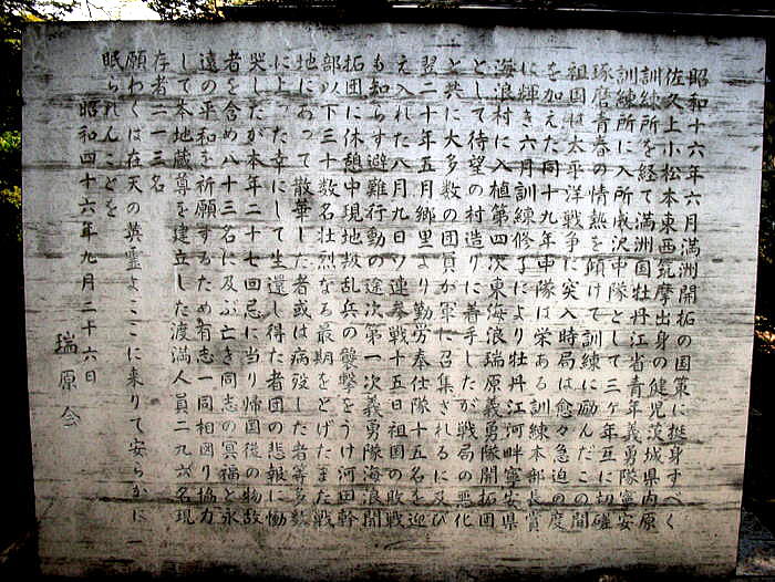 私達は堀辰雄文学記念館を跡に泉洞寺にゆきました。 ![]() 次は泉洞寺です。 ◆泉洞寺 泉洞寺は今から約410年前の、慶長3年(1598年)3月、上州(現在の群馬県長野原町)常林寺第5世・心庵宗祥禅師によって開創されました。 御開山である心庵宗祥禅師は三河国の人で元は武士です。俗名を林主人といい天正3年(1575)長篠の戦いに遭遇、数多くの戦死者を目のあたりにして無常心をいだき、当時敵方であった武田軍の本陣地、長篠の曹洞宗医王寺にて剃髪し出家をさたといわれています。 泉洞寺は、寺名「仙洞寺」であったが江戸時代、火災に遭遇したことから、火災等の災難を除けるようにと祈願して「仙洞寺」から、水を持って寺を守る様にと「泉洞寺」と改名して寺の安全を願いました。当山の御本尊様は聖観世音菩薩様です。 本山は大本山 福井県の「永平寺(えいへいじ)」高祖道元禅師さま御開山 横浜市の「總持寺(そうじじ)」 太祖瑩山禅師さま御開山 です。 教えはわたしたちはみな仏(ほとけ)の子(みこ)であり、生まれながらに仏心を具(そな)えています。しかしそれに気づかずに我がまま勝手の生活をして苦しみや悩みのもとをつくっています。 ひとたび仏さまに懺悔(ざんげ)し帰依(きえ)するならば、心が落ち着いておのずから生活が調えられて明るくなり社会のお役にたつことを喜び、又どんな苦難にも耐えて生き抜こうとする信念が生まれます。そこに生きがいと幸福とを発見するのが曹洞宗の教えであります。 泉洞寺の行事について(主なこと) 新年修正会 01月01日〜03日 高祖道元禅師降誕会 01月26日 釈尊涅槃会 03月15日 春彼岸会 大般若会 05月01日 花まつり(釈尊降誕会) 05月上旬 夏休み早朝坐禅会 08月02日〜06日(5日間) (参加自由・初心者歓迎・お出かけ下さい) 施食会 08月13日 盂蘭盆会 08月13日〜16日 秋彼岸会 両祖忌 09月29日 太祖瑩山禅師降誕会 11月21日 釈尊成道会 12月08日 二年詣り 12月31日 「泉洞寺梅花講」 (月1回) 梅花講とは曹洞宗の御詠歌である梅花流を学ぶ泉洞寺の檀信徒によって構成されています。ぜひご参加下さい。楽しく梅花流をお唱えすることで曹洞宗の教えを学べます。 出典:以上泉洞寺の公式Wegbより 以下は泉洞寺の山門の前にある不許山門....の石碑です。これは禅寺や律院などで、山門や総門の前の石柱に刻んだ標語です。"葷"とはニンニク・ラッキョウ・ネギ・ショウガを意味し、これらは強精食品で酒とともに人間の魂を乱すものとして、寺に持ち込みが禁じられていることを示しているようです。 最近では東京都文京区小石川にあります伝通院の門前にありました。 ![]() 撮影:青山貞一 Nikon Coolpix S8 2015-5-6 下は泉洞寺の山門(惣門) ![]() 撮影:青山貞一 Nikon Coolpix S8 2015-5-6 門を入る手前に、道祖神のような石仏がたくさんありました。 ![]() 撮影:青山貞一 Nikon Coolpix S8 2015-5-6 ![]() 撮影:青山貞一 Nikon Coolpix S8 2015-5-6 ![]() 撮影:青山貞一 Nikon Coolpix S8 2015-5-6 下は6体のお地蔵様です。 ![]() 撮影:青山貞一 Nikon Coolpix S8 2015-5-6 そして泉洞寺の本殿です。前に2つの灯籠があります。 ![]() 泉洞寺の本殿 撮影:池田こみち Nikon Coolpix S6400 2015-5-6 ![]() 泉洞寺の本殿 撮影:池田こみち Nikon Coolpix S6400 2015-5-6 下は泉洞寺の鐘楼です。 ![]() 泉洞寺の鐘楼 撮影:池田こみち Nikon Coolpix S6400 2015-5-6 泉洞寺の境内の一角に、以下の満州開拓団についての解説がありました。この種の記念碑は北軽井沢にもあります。 ![]() 昭和16年6月、満州開拓の国策に挺身すべく佐久上小松本東西筑摩出身の健児茨城県内原訓練所を経て満州国牡丹江省青年義勇隊寧安訓練所に入所成沢中隊として三ヶ年亘り切磋琢磨、青春の情熱を傾けて訓練に励んだ。 この間、祖国は太平洋戦争に突入時局は愈々急迫の度を加えた同19年中隊は栄ある訓練本部長賞に輝き6月訓練終了により牡丹江河畔寧安県海浪村に入植第四次東海浪瑞原義勇隊開拓団として待望の村造りに着手したが、戦局の悪化とともに多数の団員が軍に招集されるに及び翌20年5月郷里より勤労奉仕隊15名を迎え入れた8月9日ソ連参戦15日祖国の敗戦もしらず避難行動の途次第一次義勇隊海浪開拓団に休憩中現地叛乱兵の襲撃を受け河田幹部以下30数名壮烈なるなる最期をとげた。 また戦地にあって散華した者或いは病死した者多数に上った幸いにして生還し得た者団の悲報に慟哭したが本年27回忌に当たり帰国後の物故者を含め83名に及ぶ亡き同志の冥福と永遠の平和を祈願するため有志一同相図り協力して本地蔵尊を建立した渡満人296名現存者213名願わくは在天の英霊よここに来たり手安らかに眠らんことを 昭和46年9月26日 瑞原会 長野県からは多くの人々が満蒙開拓団にかりだされ、その多くの人々が亡くなったと聞いていますが、この地域からも多くの人々が行かれ亡くなったことが分かります。 青山貞一が住んでいる東京都品川区小山(旧荏原村)からも多くの人々が満蒙開拓団に行かれ、その圧倒的多くが亡くなっていると100歳になる母から聞いています。 つづく |
