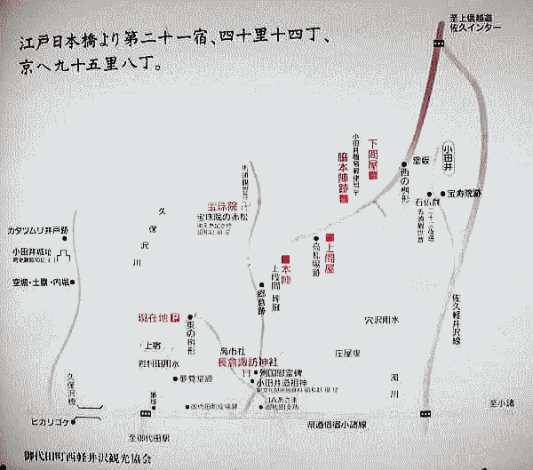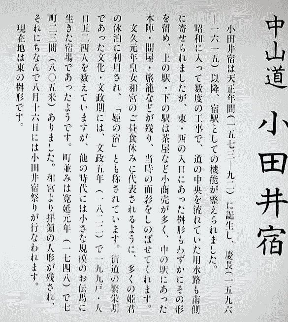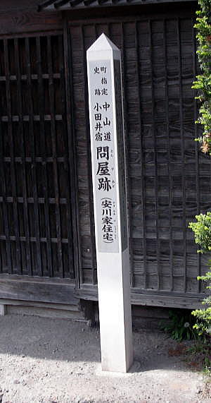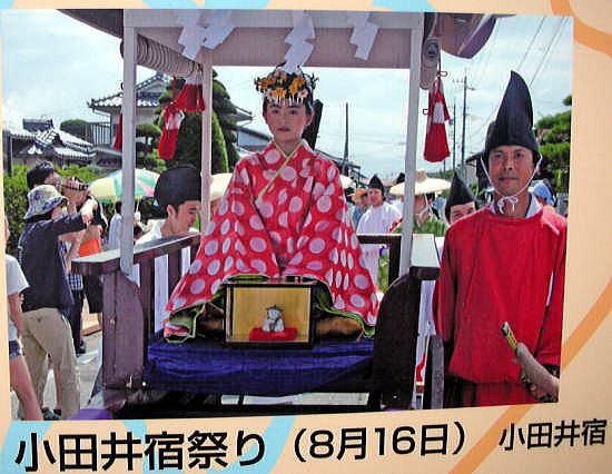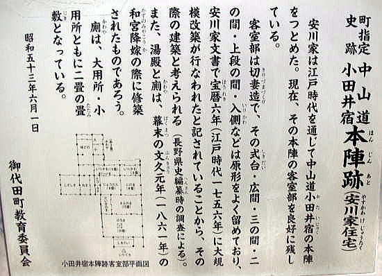 ◆小田井宿 ![]() 小田井宿(おたいしゅく)とは、中山道六十九次のうち江戸から数えて二十一番目の宿場です。 現在の長野県北佐久郡御代田町中心部にあたります。参勤交代などで大名が北国街道との分岐点でもあった追分宿で宿をとる際、小田井宿は姫君や側女たちの宿にあてられることが多く「姫の宿」とも呼ばれていました。 天保14年(1843年)の『中山道宿村大概帳』によれば、小田井宿の宿内家数は107軒、うち本陣1軒、脇本陣1軒、旅籠5軒で宿内人口は319人となっています。 下は現在の小田井宿の街路図です。北から下問屋、脇本陣跡、上問屋、本陣、長倉諏訪神社などがあります。 ![]() 撮影:青山貞一 Nikon Coolpix S8 2015-5-4 下は小田井の歌舞伎絵です。遠くに浅間山が見えます。この浅間山は、現在の浅間山とほぼ同じ形をしているので、天明三年の大噴火後であることが分かります。 ![]() 木曾街道六拾九次 小田井(歌川広重画) ![]() 撮影:青山貞一 Nikon Coolpix S8 2015-5-4 小田井宿は、天正年間(1573−92年)に誕生し、慶長(1596ー1615年)移行、宿駅としての機能が整えられました。 昭和に入って数度の工事で道の中央を流れていた用水路も南側を留め、上の駅、下の駅は茶屋など小商売が多く、中の駅にあった本陣、問屋、旅籠などが残り,当時の面影を忍ばせてくれています。 文久元年皇女和宮のご昼食休みに代表されるように、多くの姫君の休憩に利用去れ、「姫の宿」とも賞されています。街道の反映来ではった、文化・文政期には、文政5年(1822)で199戸、人口534人を数えていますが、他の時代には小さな規模のお伝馬に生きた宿場で会ったようです。 町並みは寛延元年(1748)で7町23間(805m)ありました。和宮より拝領の人形が残され、それにちなんで8月16日には小田井宿祭りが行われます。現在地は、東の枡形です。 写真では、皇女和宮に扮した若い女性が控除和宮から授かった小さな人形をもっています。、 ![]() 8月16日の小田井祝祭り 和宮より拝領の人形が見えます 撮影:青山貞一 Nikon Coolpix S8 2015-5-4 ![]() 撮影:青山貞一 Nikon Coolpix S8 2015-5-4 安川家は江戸時代を通じて中山道小田井宿の本陣をつとめました。 現在、その本陣の客室部を良好に残しています。 客室部は切り妻造りで、その式台、広間、三の間、二の間、上段の間、入川などは原形をよくとどめており、安川家文書で宝暦6年(江戸時代1756年)に大規模改修が行われたときされていることから、その際のけんとくとかんがえられたと記されていることから、その際の建築と感がられています。 また、湯殿と厠は、幕末文久元年(1861年)の和宮降嫁の際に修蓄されたものと思われます。 厠は、大用所、小用所ともに二条の畳敷となっています。 昭和53年6月1日 御代田町教育委員会 下はその本陣跡です。 ![]() 撮影:青山貞一 Nikon Coolpix S8 2015-5-4 ![]() 撮影:青山貞一 Nikon Coolpix S8 2015-5-4 ![]() 撮影:青山貞一 Nikon Coolpix S8 2015-5-4 下は小田井宿の面影を残す建物の一部です。 ![]() 撮影:青山貞一 Nikon Coolpix S8 2015-5-4 ![]() 撮影:青山貞一 Nikon Coolpix S8 2015-5-4 下はおそらく旅籠です。 ![]() 撮影:青山貞一 Nikon Coolpix S8 2015-5-4 ![]() 撮影:青山貞一 Nikon Coolpix S8 2015-5-4 ![]() 撮影:青山貞一 Nikon Coolpix S8 2015-5-4 つづく |