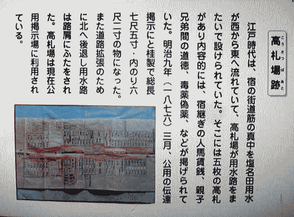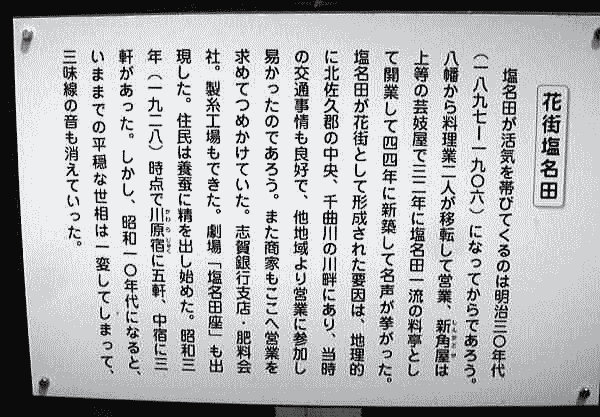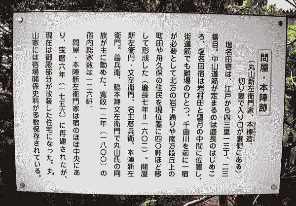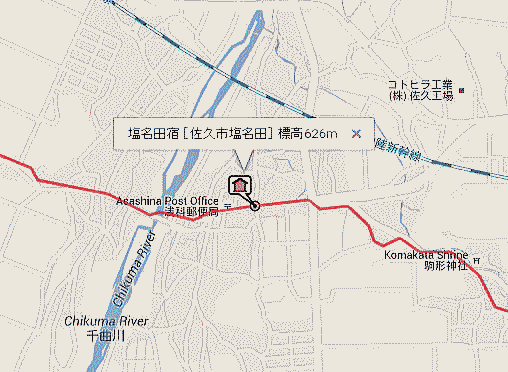 ◆塩名田宿 塩名田宿(しおなだしゅく)とは、中山道六十九次のうち江戸から数えて二十三番目の宿場です。 現在の長野県佐久市塩名田です。 暴れ川であった千曲川の東岸にあり、旅籠が10軒以下の小さな宿場にも拘らず、本陣と脇本陣が合わせて3軒ありました。橋も掛けられましたが洪水の度に流失し、船や徒歩で渡るのが専らであったと言います。 天保14年(1843年)の『中山道宿村大概帳』によれば、塩名田宿の宿内家数は116軒、うち本陣2軒、脇本陣1軒、旅籠7軒で宿内人口は574人でした。 ![]() 撮影:青山貞一 Nikon Coolpix S8 2015-5-4 ![]() 木曾街道六拾九次 塩名田(歌川広重画) ![]() 塩名田宿 出典:中山道六十九次 旧中山道地図 旧街道地図 中山道で唯一千曲川と合流する宿場です。 近郷無類の暴れ川と呼ばれる千曲川の氾濫に苦心しており、明治期になって舟をつないでその上に板を架けて橋とする「船橋」方式がとられました。 現在も格子戸が残る街並みには旧屋号の看板が下げられており、老舗の川魚料理店があります。 水と緑の深い塩名田宿 塩名田宿は江戸から数えて23番目の宿場です。 宿高五百四十五石三斗六升七合。江戸から四十三里十三町十四間。往還通りの長さ十町二間。宿の西方に桝形が残り、東西に長い宿場です。 本陣二軒、脇本陣一軒、旅籠七軒ありました。 出桁造りの家並み、大屋根の本陣跡など、舗道も整備されています。 宿場を出ると目の前は千曲川で、江戸時代初期には架橋されていましたが、千曲川は度々氾濫し、橋の破損に苦心していました。 旅人は橋が流失すると渡し船で渡らなければならず、水の深さにより料金が高くなるため、宿場に逗留する方が安くついたという。明治期に入り、舟をつないで橋とする「舟橋」方式がとられるようになりました。 ![]() 撮影:青山貞一 Nikon Coolpix S8 2015-5-4 ●問屋・本陣跡 (丸山新左右衛門家、本棟造、切り妻で入り口が妻側にある) 塩名田宿は、江戸から四三里一三丁、二三番目。中山道筋が定まるのは慶長の初め頃、塩名田宿は岩田村と望月の中間に位置し、街道筋でも難所のひとつ、千曲川を前に一宿が必要として北方の岩下通りや南方段丘上の町田や舟久保の住民を現位置に四十軒ほど移して形成した(慶長七年=1602)。 問屋新左衛門・文左衛門、名主彦兵衛、本陣新左衛門。善兵衛、脇本陣文左衛門で丸山氏の同族が主に勤めた。寛政12年(1800)の宿内総家数は126軒。 問屋・本陣新左衛門家は、宿のほぼ中央にあり、宝暦六年(1756)に再建されたが、現在は御殿部分が改装した住宅になった。丸山家には宿場関係資料が多数保存されている。 ![]() 撮影:青山貞一 Nikon Coolpix S8 2015-5-4 ![]() 撮影:青山貞一 Nikon Coolpix S8 2015-5-4 現浅科公民館前に「問屋・本陣跡」と「高札場跡」が残されています。千曲川の渡しとして発展し、江戸時代には宿駅として諸大名が泊るように指定されており、建物の延べ床面積が200坪近くあったと記録されています。 ![]() 撮影:青山貞一 Nikon Coolpix S8 2015-5-4 ![]() 撮影:青山貞一 Nikon Coolpix S8 2015-5-4 ![]() 撮影:青山貞一 Nikon Coolpix S8 2015-5-4 ●高札場跡 江戸時代は、宿の街道筋の真中を塩名田用水が西から東へ流れていて、高札場が用水路をまたいで設けられていた。そこには五枚の高札があり、内容的には、宿継ぎの人馬賃銭、親子兄弟の道徳、毒薬偽薬、などが掲げられていた。 明治九年(1876)三月、公用の伝達掲示にと桂製で総長七尺五寸・内のり六尺二寸の物になった。また道路拡張のために北へ後退し用水路は路肩にふたをされた。高札場は、現在公用掲示場に利用されている。 ![]() 撮影:青山貞一 Nikon Coolpix S8 2015-5-4 ●花街塩名田 塩名田が活気を帯びてくるのは明治30年代(1897〜1906)になってからであろう。八幡から料理業二人が移転して営業、新角屋は上等の芸妓屋で32年に塩名田一流の料亭として改行して44年に新築して名声が上がった。塩名田が花街として形成された要因は、地理的に北佐久郡の中央、千曲川の川畔にあり、当時の交通事情も良好で、他地域より営業に参加しやすかったのであろう。 また、商家もここへ営業を求めてつめかけていた。志賀銀行支店・肥料会社。製紙工場もできた。劇場「塩名田座」も出現した。住民は養蚕に精を出し始めた。 昭和3年(1928)時点で川原宿に五軒、中宿に三軒があった。 しかし、昭和10年代になると、いままでの平穏な世相は一変してしまって三味線の音も消えていった。 ![]() 撮影:青山貞一 Nikon Coolpix S8 2015-5-4 ![]() 塩名田宿の町並み 撮影:青山貞一 Nikon Coolpix S8 2015-5-4 ![]() 撮影:青山貞一 Nikon Coolpix S8 2015-5-4 ![]() 撮影:青山貞一 Nikon Coolpix S8 2015-5-4 ![]() 撮影:青山貞一 Nikon Coolpix S8 2015-5-4 ![]() 撮影:青山貞一 Nikon Coolpix S8 2015-5-4 ![]() 撮影:青山貞一 Nikon Coolpix S8 2015-5-4 ![]() 撮影:青山貞一 Nikon Coolpix S8 2015-5-4 ![]() 撮影:青山貞一 Nikon Coolpix S8 2015-5-4 ![]() 撮影:青山貞一 Nikon Coolpix S8 2015-5-4 ![]() 撮影:青山貞一 Nikon Coolpix S8 2015-5-4 ![]() 撮影:青山貞一 Nikon Coolpix S8 2015-5-4 ![]() 撮影:青山貞一 Nikon Coolpix S8 201