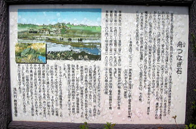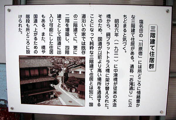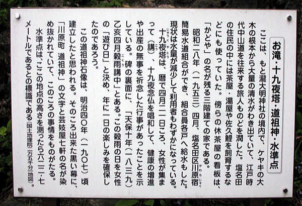 下は現在塩名田の町です。左側に千曲川があり、真ん中に中山道が通っています。右上に塩名田神社があります。正縁寺は、中央の少し上にあります。 ![]() 出典:グーグルマップ ◆塩名田の神社・稲荷・寺院 ![]() 撮影:青山貞一 Nikon Coolpix S8 2015-5-4 ![]() 塩名田神社 ![]() 撮影:青山貞一 Nikon Coolpix S8 2015-5-4 ![]() 撮影:青山貞一 Nikon Coolpix S8 2015-5-4 ![]() 撮影:青山貞一 Nikon Coolpix S8 2015-5-4 ![]() 塩名田の正縁寺 出典:グーグルマップ・ストリートビュー ![]() 撮影:青山貞一 Nikon Coolpix S8 2015-5-4 江戸期以前に現正縁寺の北方向に落合善光寺と称される寺があり合戦で消失してしまいました、 江戸初期に「超誉一念和尚」によりこの地に正縁寺として再建されました、正縁寺は中山道中此処で亡くなった旅人も埋葬していました、 寺内の墓碑には出身地、身分、死因などが記されて中には千曲川での事故死と記された墓碑もあります。 正縁寺門前には儒学者であった佐藤家により筆塚が建立されています。 ![]() 撮影:青山貞一 Nikon Coolpix S8 2015-5-4 ◆小滝・十九夜塔・道祖紙・水準点 ![]() 撮影:青山貞一 Nikon Coolpix S8 2015-5-4 ![]() 撮影:青山貞一 Nikon Coolpix S8 2015-5-4 ここはもと瀧大明神社の境内で,ケヤキの大木が根元から大量の清水が湧き出ていて、江戸時代中山道を往来する旅人ものどを潤していました。 塩名田の住民の中には茶屋、湯屋や佐久鯉を飼育するなどにも使っていました。 傍らの休茶屋の看板は、「かどや」の名が残る三階建ての家です。 昭和28年(1953年)4月、塩名田区川原宿簡易水道組合が出来、組合員各戸へ給水もしました。 19夜塔は、暦で4月21日ころ、女性があつまって(講)、19夜念仏を唱和して、健康の増進や出産の無事を祈念した行事した行事があったことを示しています。 碑の裏面に、「天保十年(1839年)の「遊び日」と決め、年に一日の楽しみを確保したのでしょう。 この道祖神石像は、明治40ネン(1907年)頃建立したと思われます。その頃出来た黒い幕に、「河原町道祖神」の門司と芸子暦七軒の長染め抜かれていて、このころの事情を物語っています。 水準点は、ここの地点の高さを測ったら、622.7mであえるとのひょうしきです(国土地理院地図) ![]() 十九夜塔 撮影:青山貞一 Nikon Coolpix S8 2015-5-4 下は十九夜塔の隣にあった休茶屋です。 ![]() 十九夜塔の隣にあった休茶屋 撮影:青山貞一 Nikon Coolpix S8 2015-5-4 ![]() 撮影:青山貞一 Nikon Coolpix S8 2015-5-4 真楽寺道標は中山道から真楽寺へ向う参詣者のためのものです。 参詣道は塩名田宿本陣から小諸道を北上し耳取を通り、加増の蛇堀からは東進して御代田塩野の真楽寺に至ります。御代田の真楽寺も参照ください。 建立年は文化二年(1802年) ◆舟つなぎ石 江戸時代、塩名田宿付近の千曲川は、流れも急で、洪水のたびに橋が流されていました。 さらに、橋の架けなおしには負担も大きかったことから、一時舟渡しも行われましたが、不都合も多く、結局、橋を架ける方式がとられ、幕府は、橋を維持するため、佐久・小県郡内の村々で組合を組織させ、これにあたらせました。 明治に入り、組合での維持管理ができなくなってしまい、新たに船橋会社がつくられました。この会社では、明治6年(1873年)に千曲川に九艘そうの船をつないで、その上に板を架けて橋とする「船橋」方式により渡川を確保しました。 その際、船をつなぎとめるために使われたのが、上部に穴を開けた大きな岩石で「舟つなぎ石」を呼ばれています。 その後、明治25年(1892年)に木橋が架けられたことから、船橋とともに舟つなぎ石はその役割を終え、現在では、船橋時代の苦労を物語る歴史遺産として、千曲川の流れを静かに見つめています。 出典:佐久市 ![]() 撮影:青山貞一 Nikon Coolpix S8 2015-5-4 ![]() 撮影:青山貞一 Nikon Coolpix S8 2015-5-4 ◆御馬寄(みまよせ) ![]() 撮影:青山貞一 Nikon Coolpix S8 2015-5-4 御馬寄は、字のごとく馬を寄せ集めた所からきている古代の官牧(かんぼく、勅旨牧とも)の望月牧の貢馬(こうば)をここで寄せ集めたとのことです (長野県浅科村御馬寄) ◆三階建て住宅群 ![]() 撮影:青山貞一 Nikon Coolpix S8 2015-5-4 ![]() 撮影:青山貞一 Nikon Coolpix S8 2015-5-4 塩名田の「川原宿」にはところどころに情緒豊かな三階建て住居があります。通称、「お滝通り」にたちどまると気づきます。 昭和6年(1931年)に中津橋が従来の木造橋から、鋼プラットトラス橋に掛け替えられました。そのため、国道が以前より高い場所を通過することになって、純粋な三階建て住宅とは別に、国道沿いの家では毀損の二階建てに、さらに二階を増築し、四階建てとして国道に出入り可能にした住居もあります。 また、橋や国道にあがるための階段もところどころに設けられました。 ![]() 鋼プラットトラス橋 下は千曲川 出典:グーグルマップ・ストリートビュー 下は橋の上から見た塩名田の町並み ![]() 出典:グーグルマップ・ストリートビュー つづく |
