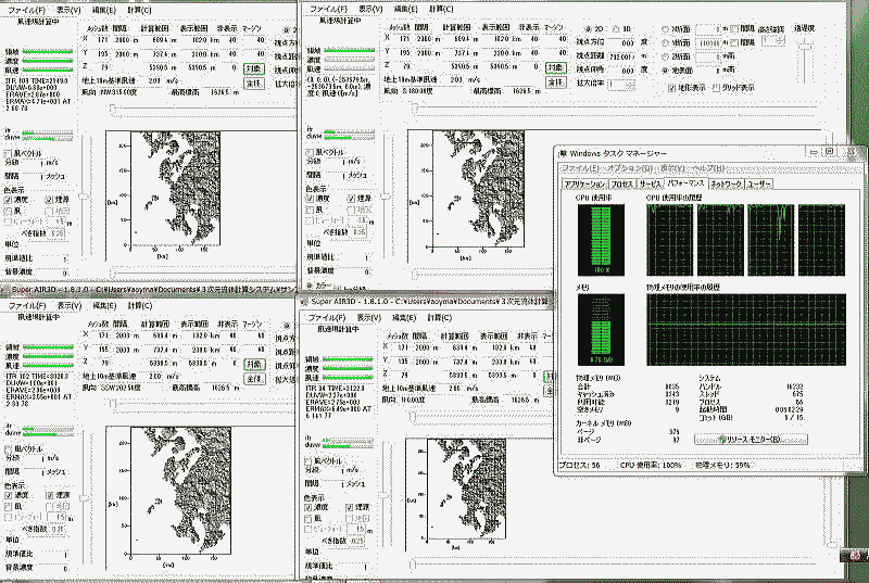 たとえば、Intel社のCore i5 〜 i7の第二世代CPU(Sandy Bridge)は、ひとつのCPUに従来のCPUが4個統合されており、上述の規模の3次元シミュレーションを相互の計算速度を落とすことなく、同時に4ケース計算させることが可能となっている。 しかも、型番の最後にKのつくCPUは、4個あるCPU単体のクロック周波数は、ターボ計算機能、OC(オーバークロック)機能がついており、空冷で通常の1.5倍程度まで計算速度を上げることが可能となっている。 ちなみに以下のCPU(Intel Core i5 2500K)の単体価格は、17000円前後である。 ![]() ![]() 図 インテルの第二世代 Sandy Bridge CPU Intel Core i5 2500Kの外観 ![]() 図 スーパーパソコンの心臓部、マザーボードにCPU:Intel Core i5 2500Kとメモリー8GBを取り付けたところ。 撮影:青山貞一 Nikon CoolPix S8 ![]() 図 CPU:Intel Core i5 2500K、メモリー8GB、HDD2TB の仕様をもったスーパーパソコン全容。ケース、電源込みで約5万円である 2012年4月29日、Intel社は Core i5 3570K, i7 3770K など第三世代のCPUを発表したが、これら第三世代のCPUは使用ピーク電力を従来の95Wから77Wにするなど省電力化となっており、計算速度、負荷対応などはほとんど第二世代のCPUと変わっていない。 ■ERI版SPEEDIのシステムSuper Air 3Dの大幅改良 ここ数ヶ月、青山、鷹取は、ERIの3次元流体シミュレーションモデルを大幅に改良・拡充してきた。現在、1.8.0.0。 従来からSuper Air 3Dで数値計算(有限差分法)を行う部分は、フォートランでプログラミングしてきたが、それをC言語の系統のオブジェクト指向言語C#に全面的に移植した。 これにより、高速パソコン上でグラフィックインターフェースを活用でき、地形データ作成の段階から全面に対話型の処理により、高度な有限差分法による3次元流体数値計算と結果表示、感度分析などが可能となった。 下は、Super Air 3D ver1.4.0.0 システムのエントランス画面である。 Super Air 3D ver1.4.0.0では、CPUがインテル社のi5,i6,i7のCPUを使ったパソコンの場合、主記憶容量が8GB以上あれば、相互の計算速度を損なうことなく同時に最大4つの風向を計算可能である。 ![]() Super Air 3D ver1.4.0.0 のシステムエントランス画面 Super Air 3Dver1.4.0.0 では、上記の対象範囲の風場、濃度を系サインする場合でも、以下に示すように、境界条件設定に際しては、x,yそれぞれの方向に140km程度のx,y,z空間をマージンとしてとっている。 ![]() Super Air 3D ver1.4.0.0 システムにおけるx,y方向の 境界条件設定の例 以下は、 による数値計算画面である。 この例示では川内原発について180km×200kmの広域を対象に4風向の数値計算を同時に行っている。4コア、4スレッドのCPUが対応4台のCPUを使い4台×4CPU=16風向を同時掲載可能となっている! リアルタイムモニターでSuper Air 3Dの計算状況、CPU使用率、主記憶域の占有率を監視している |