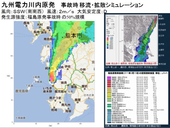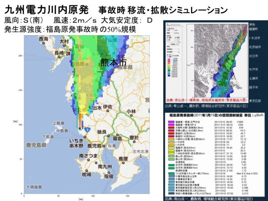以下は九州電力川内原発事故時の南風系、2m/s、大気安定度Dの全シミュレーション結果である。 メッシュ規模は1km×1km、発生源強度は福島第一原発事故時(2011年3月15日)にモニタリングポストで観測されたデータを距離及び風向をもとに逆シミュレーションして求めた値の50%としている。 なお、シミュレーション図を見る上での基礎と前提界条件については、必ず以下を参照のこと。 ◆青山貞一・鷹取敦:原発事故の影響範囲推定 @基礎と前提 表 九州電力川内原子力発電所の諸元