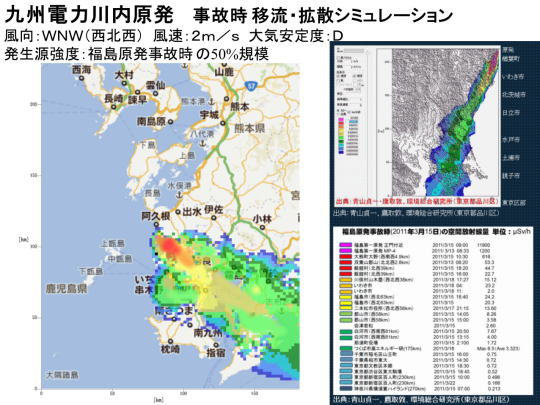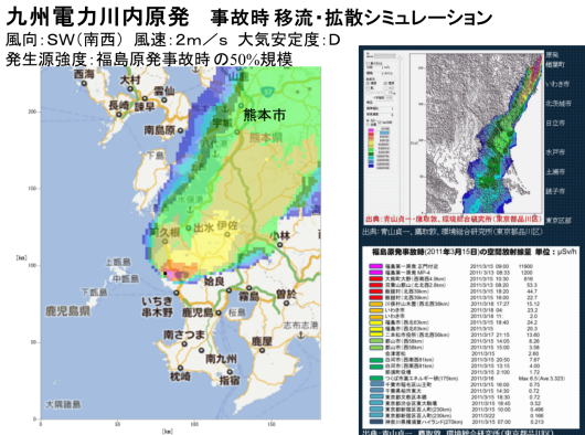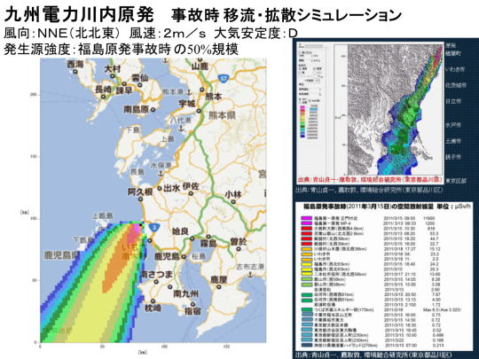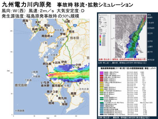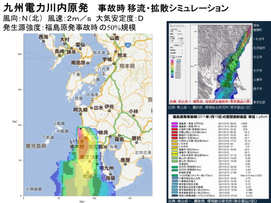 ![]() 川内原発事故時シミュレーション対象地域の地形図 出典:グーグルマップより環境総合研究所作成 ■九州電力 川内原発事故時の北風系シミュレーション ![]() 図1 川内原発事故時、南風、風速2m/s、大気安定度D ![]() 図2 川内原発事故時、南南西風、風速2m/s、大気安定度D ![]() 図3 川内原発事故時、南西風、風速2m/s、大気安定度D ![]() 図3 川内原発事故時、西風、風速2m/s、大気安定度D ![]() 図5 川内原発事故時、西北西風、風速2m/s、大気安定度D ![]() 図6 川内原発事故時、北風、風速2m/s、大気安定度D ![]() 図7 川内原発事故時、北北東風、風速2m/s、大気安定度D 上記シミュレーションの分級色は、以下の福島原発事故時(2011年3月15日)の色を参照されたい。