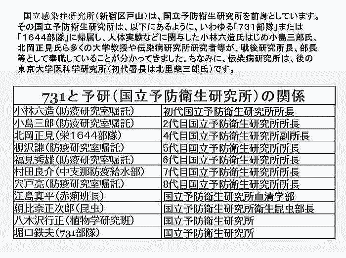 総合目次へ 731部隊の推定組織 731部隊に関与した医師・医学者 731部隊関与者のその後 ◆731部隊に関与した医者、医学者の その後(国立予防研究所で返り咲き者) 以下の表は、戦前の伝染病研究所(現在の東京大学医科学研究所)から731部隊にさまざまな植生で参加し人体実験などに関与し、戦後、国立予防衛生研究所を経由し、国立感染症研究所の所長や部長となった研究者のリストである。 , 731部隊の多くの関係者は、人体実験データなどを米国に渡すことをバーターとして、ロシアのハバロフスク裁判の被告となった者以外は、全員刑事訴追を免れて、その後日本に渡り、京大、東大などの総長や医学部長などになっている。 以下の資料は、そのうち、戦前伝染病研究所(現在、東大医科研)から731部隊に参加し、戦後、国立予防衛生研究所を経由し国立感染症研究所の幹部となった研究者のリストである。 ![]() 主な出典:この世の地獄!水俣病・731部隊・南京大虐殺 ◆731部隊と伝染病研究所(のちの東京大学医科学研究所) 東京大学医科学研究所(通称、医科研)は、初代所長が北里柴三郎でありいわばエリート医学者のための研究所でもある。