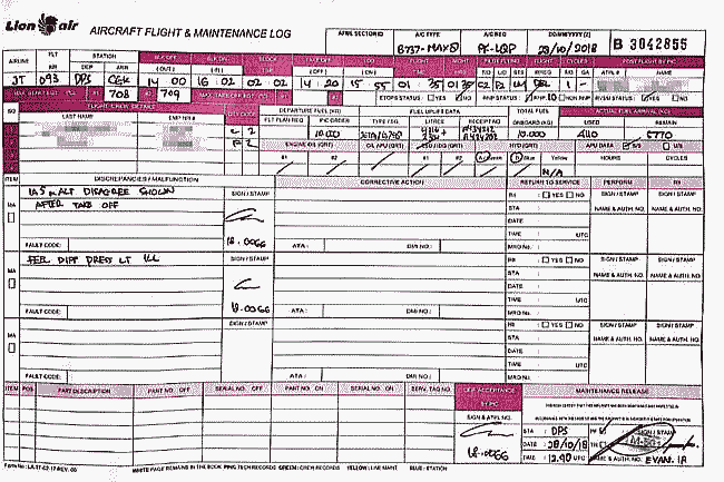 図5 ライオン航空機の前便(前回フライト)のメンテナンス記録には、2018年10月29日に飛行開始13分でBoeing