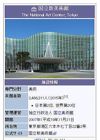 2016年12月2日、東京六本木にあります国立新美術館に、新装3年目の日展を拝見に行きました。 ※ 改組 新 第3回日展(平成28年度) http://www.nitten.or.jp/exhibition/junkaiten.html 日展は公益社団法人 日展(日本美術展覧会)が行う展覧会です。部門は、以下にあるように、日本が、洋画、彫刻、工芸美術それに書となっています。 ![]() 出典:日展 以下は会場となっている国立新美術館(東京都港区六本木)です。